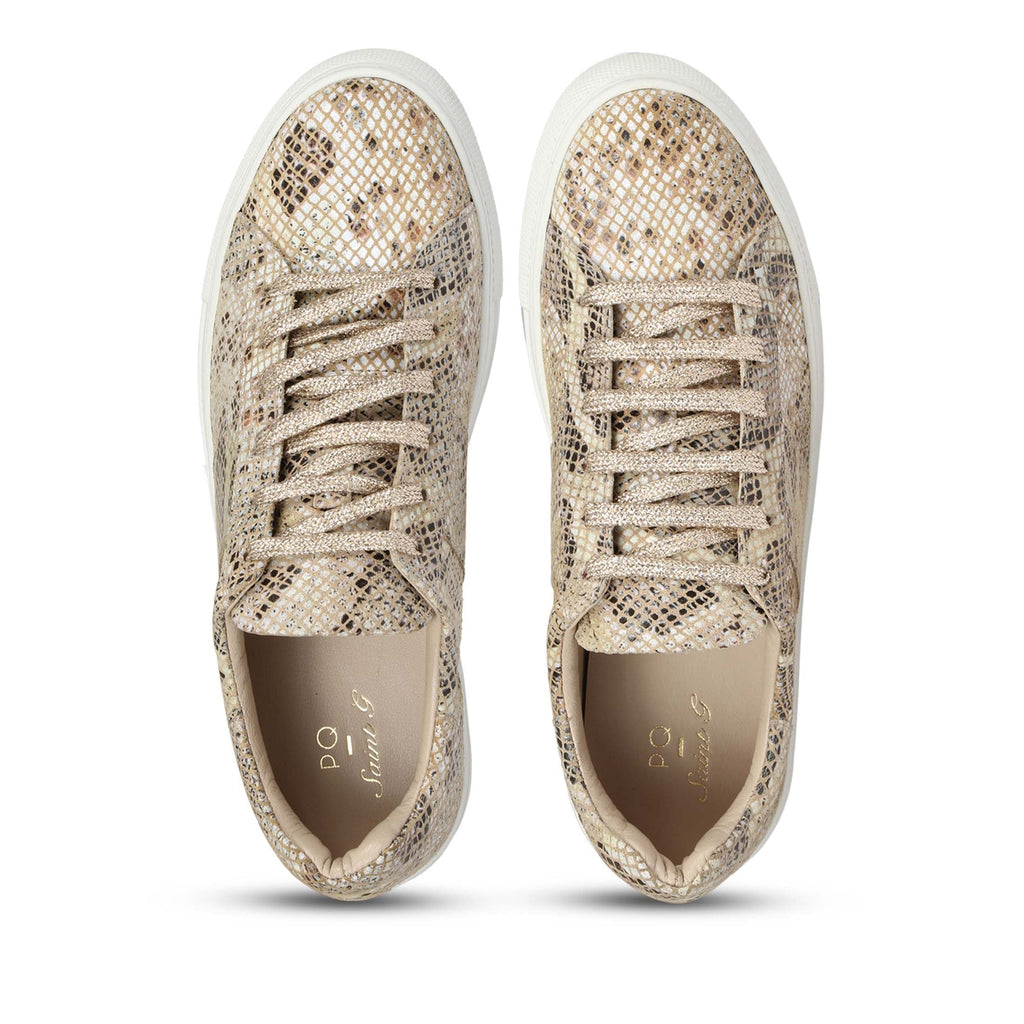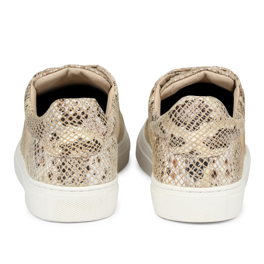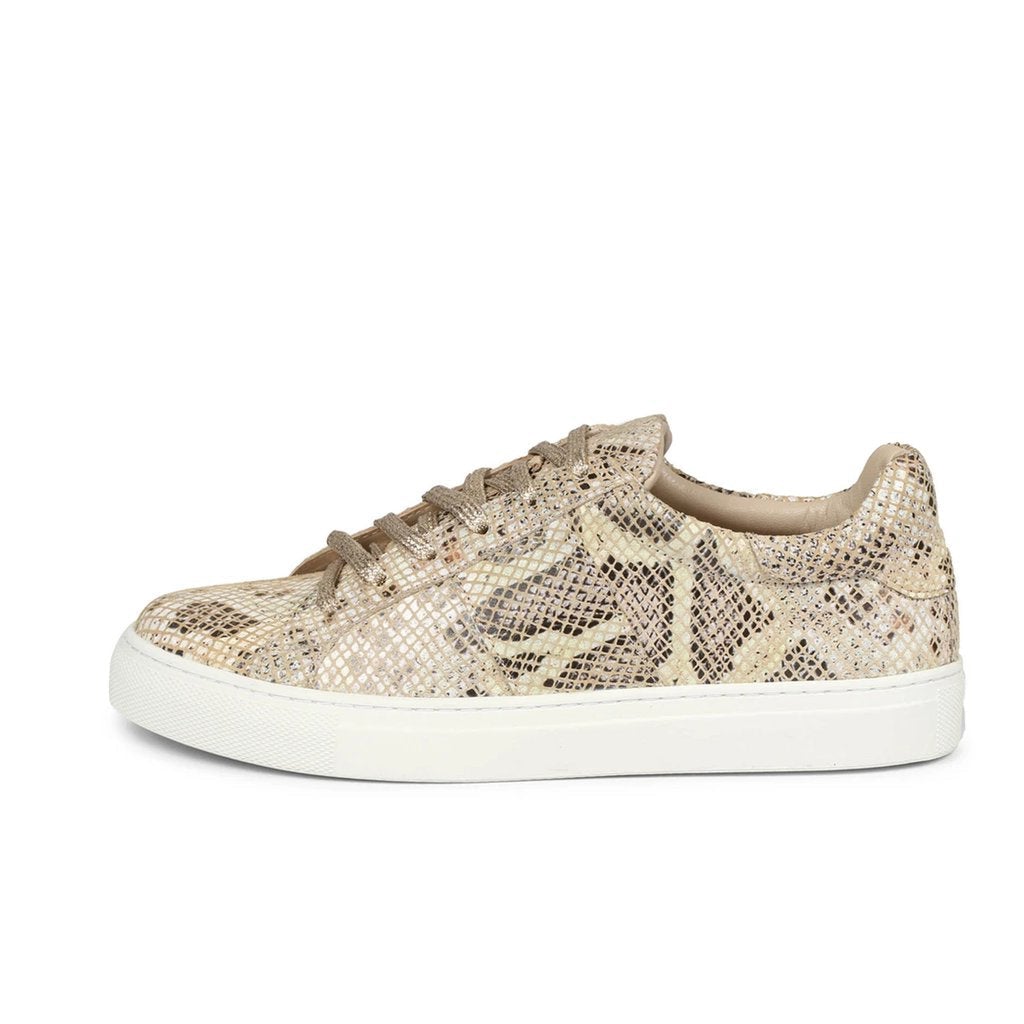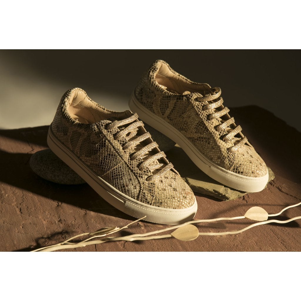 Featuring a beige python textured leather Sneakers, has a lace up closure with textured white rubber sole and comfortable padded leather footbed with gold & white lace. Treat yourself to a touch of added luxury with the understated styles in this classic range.
