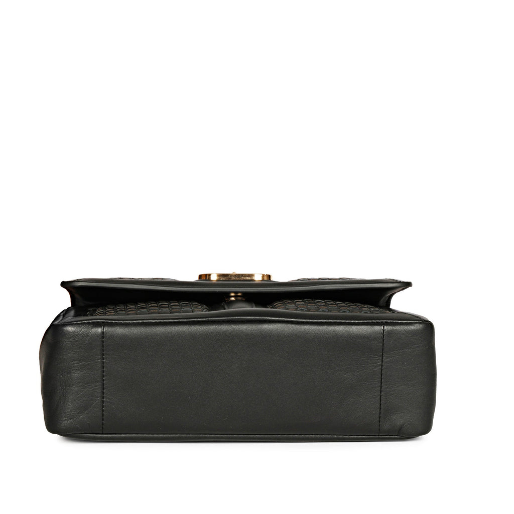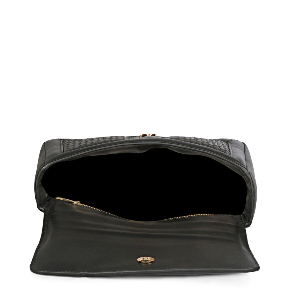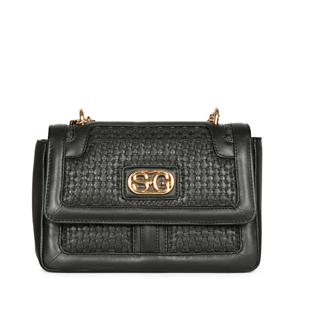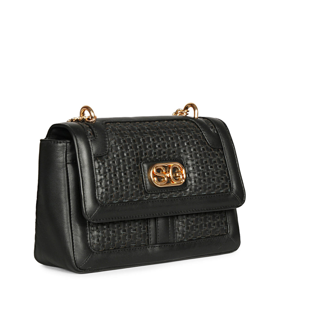 Catch All Eyes, an accessory that deserves a night out on the town, the Addie black leather sling bag is an ultra luxe bag featuring an incredible weave detail, a detachable gold toned metal chain sling strap. Has a magnetic button closure. this sling bag from SaintG adds dimension to all of your looks,