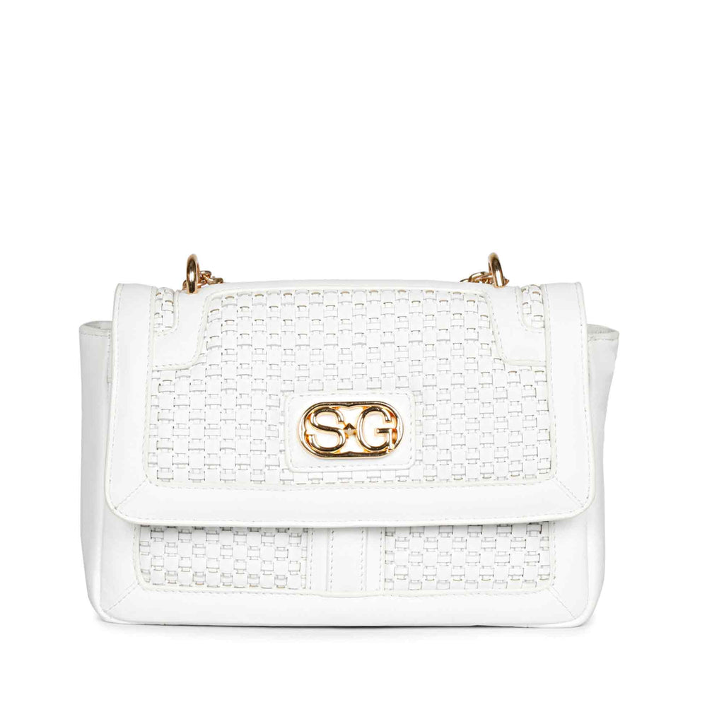 Catch All Eyes, an accessory that deserves a night out on the town, the Addie white leather sling bag is an ultra luxe bag featuring an incredible weave detail, a detachable gold toned metal chain sling strap. Has a magnetic button closure. this sling bag from SaintG adds dimension to all of your looks,