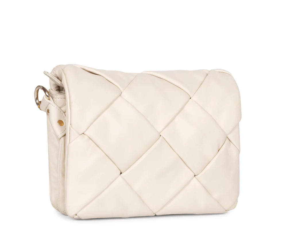Add a little luxe to your look with this Kate woven bag. Made of premium quality leather for durability, this cream leather cross body bag has an adjustable strap for carrying comfort. It features a snap closure and a woven pattern for added attraction.