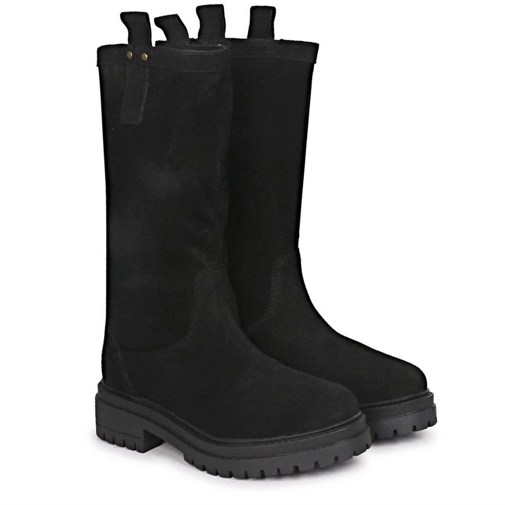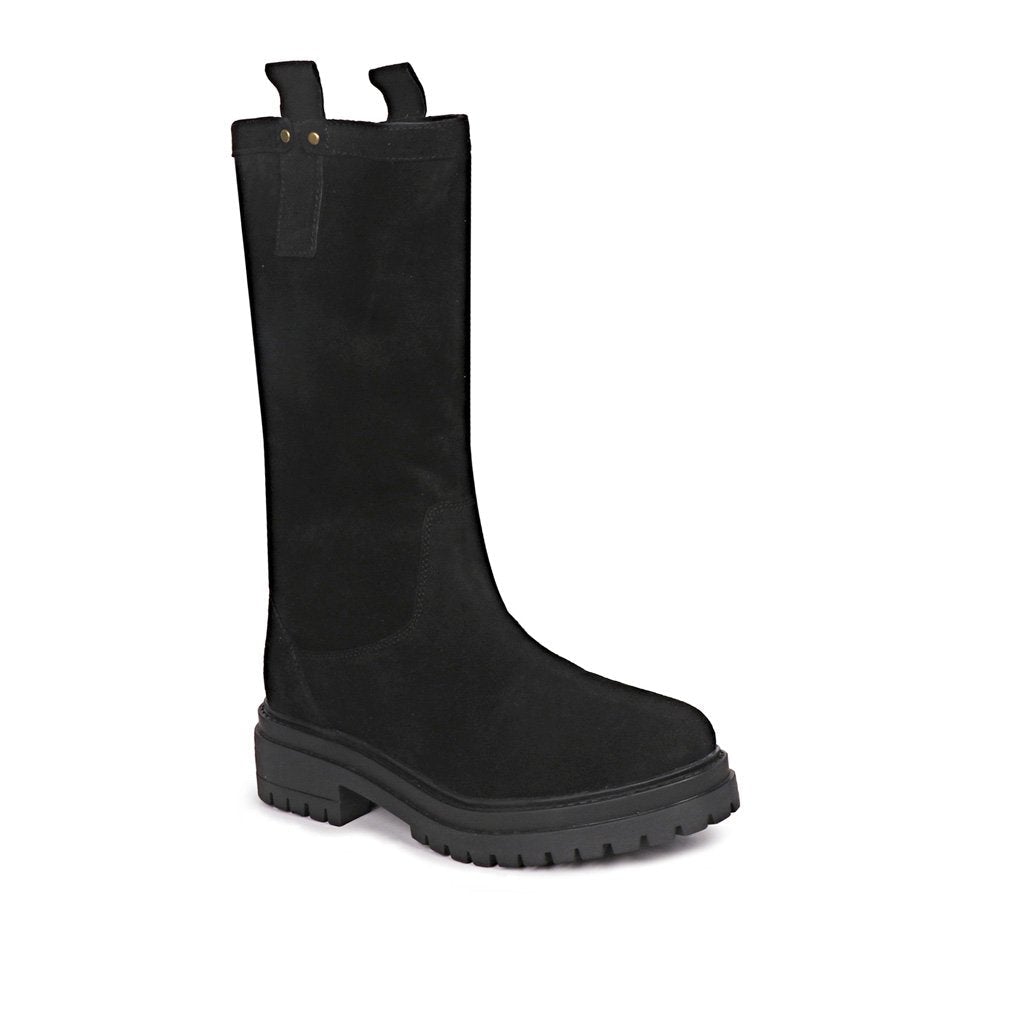 A pair of Saint Alexandra black suede leather calf boot features stitching details with paneled finish, a rounded toe and leather loop both side on top. This top-notch suede leather boot by SaintG will keep you looking stylish all year long. Complete with black leather lining, padded leather footbed and a slip-resistant black TPR sole provides superior grip on various surfaces. A low heel makes this boot a stylish choice for any occasion.