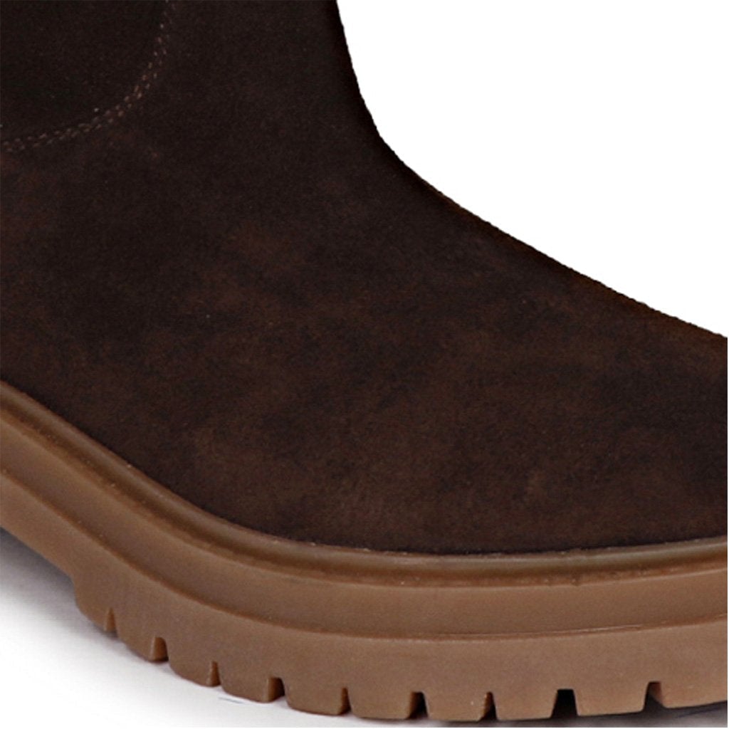 A pair of Saint Alexandra dark brown suede leather boot features stitching details with paneled finish, a rounded toe and leather loop both side on top. These top-notch suede leather boots by Saint G will keep you looking stylish all year long. Complete with leather lining, padded leather footbed and a slip-resistant Honey TPR sole provides superior grip on various surfaces. A low heel makes this boot a stylish choice for any occasion. The Height of the boot is 33 cm.