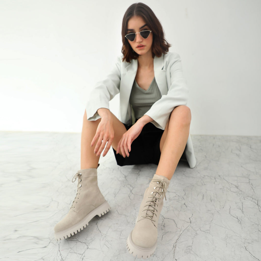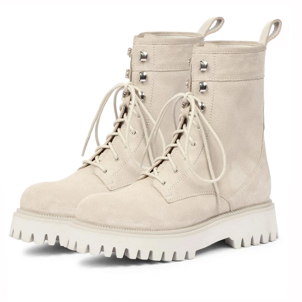 Sophistication and style go hand-in-hand when it comes to SaintG latest collection. These ivory biker boots are crafted from premium leather upper, breathable leather lining and padded leather insole. Featuring lace-up front, metal eyelet with metal hooks, comes with a slip-resistant eva biker sole which ensures that you do not slip or fall on any surface. The suede leather upper, stitching accents, rounded toe and leather pull up tab completes the design.