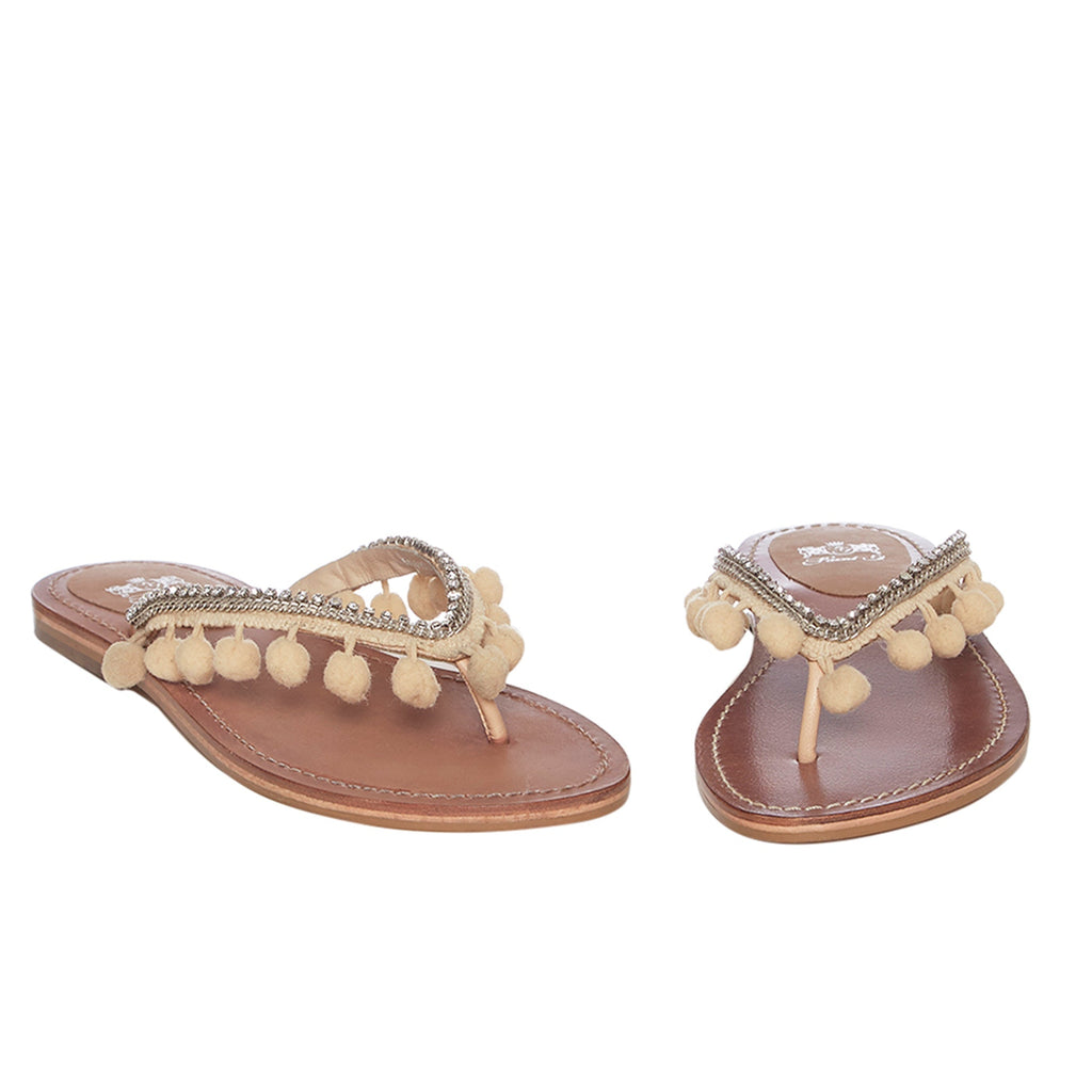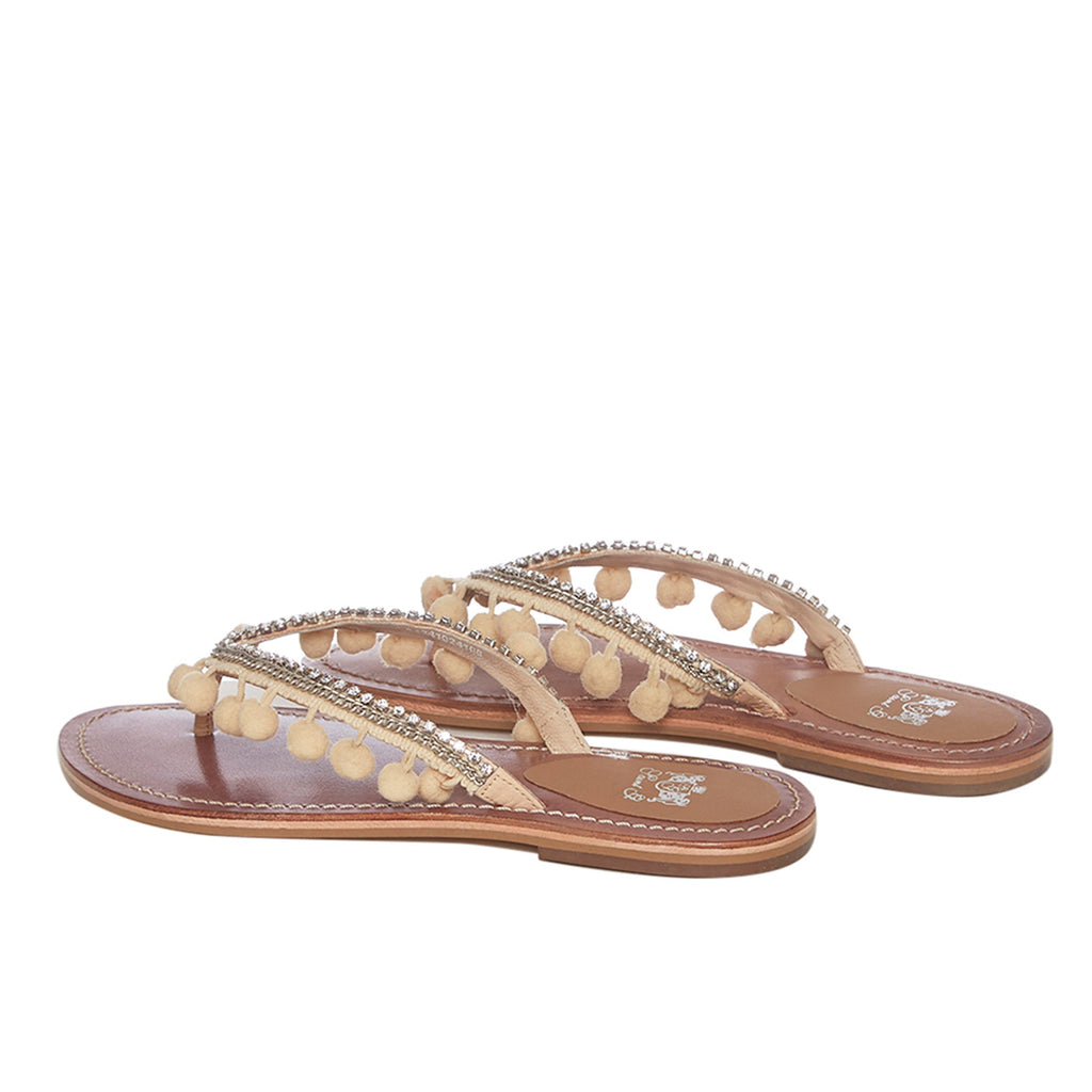 Beige Pom Pom Detail Rhinestone Chain Flip Flops