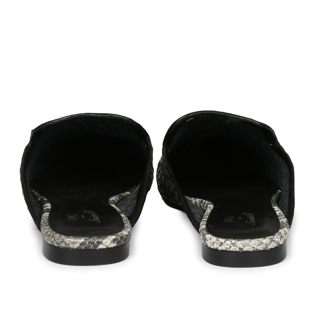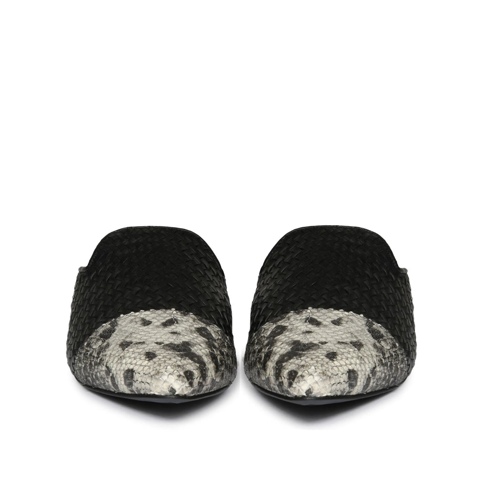 Showcasing a chic pointed toe design flat mules. The easy slip-on style finished in a black woven and grey python textured leather material. Slip it on when you want a smarter alternative to sandals or slides.
