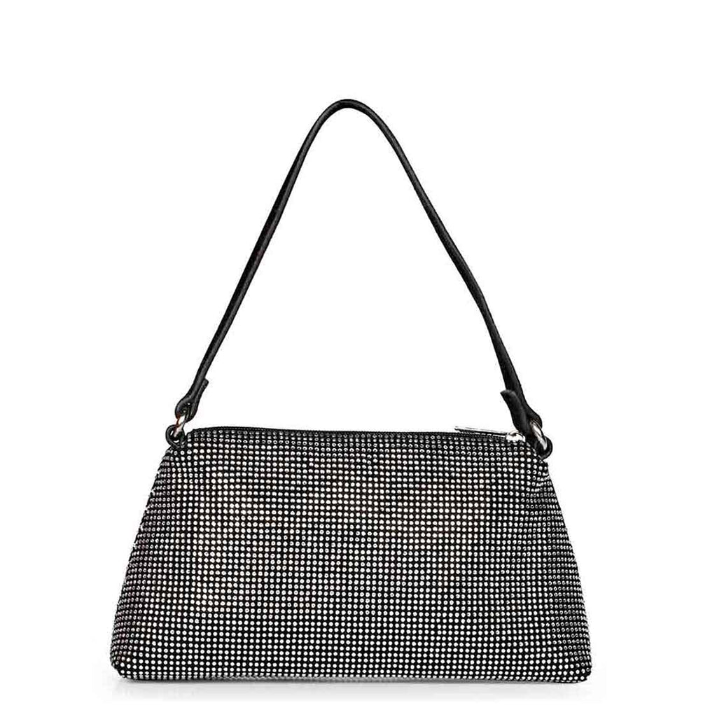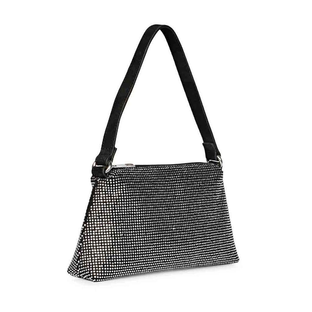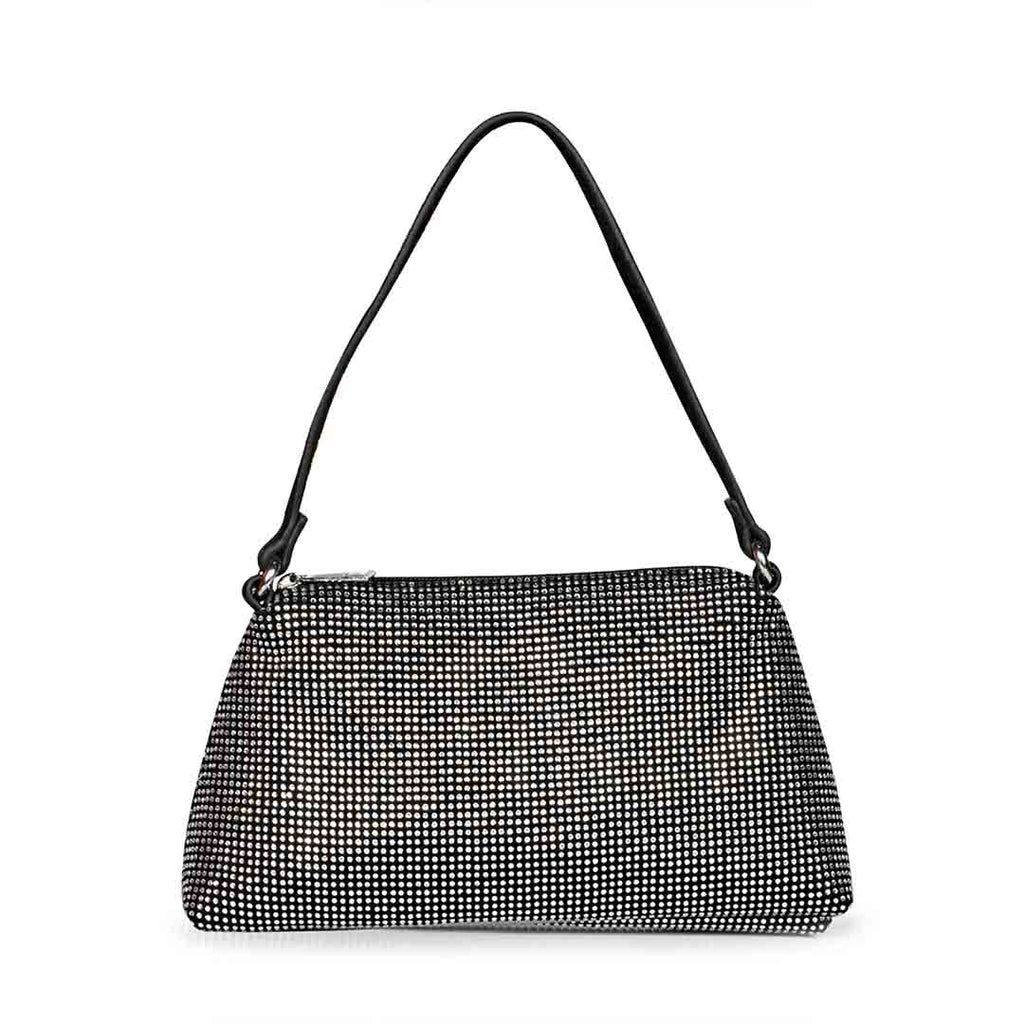 Show your unique style with this exquisite Alma Crystal Embellished Black Leather Mini Handbags. It features luxurious black crystal embellished leather upper and cotton lining with a Zipper closure.