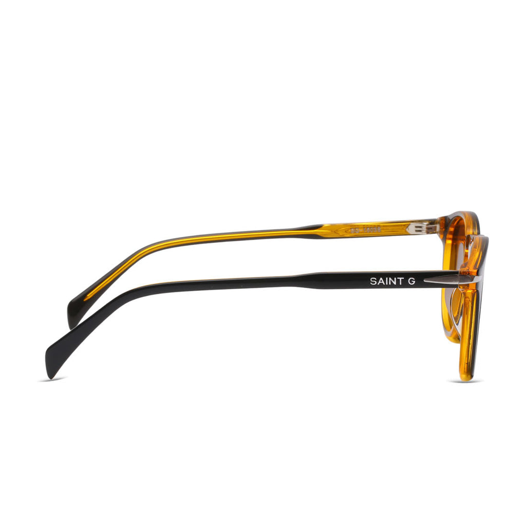 - Temples: Slimline Arms with Saint G® Silver Branding | Amber Inner Detail
