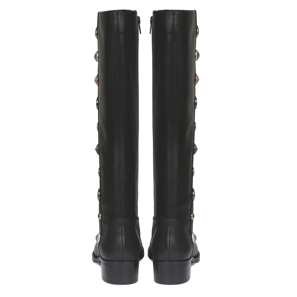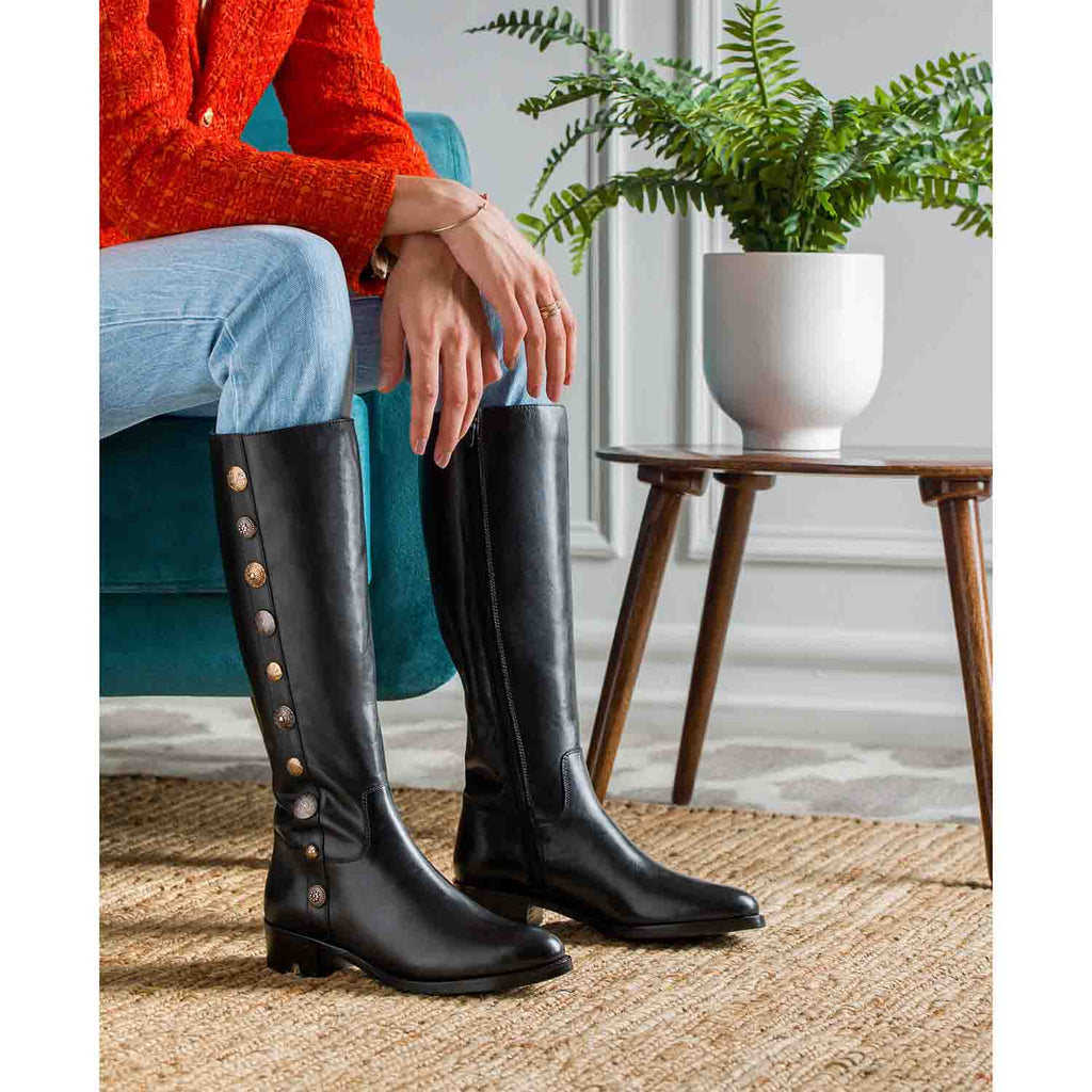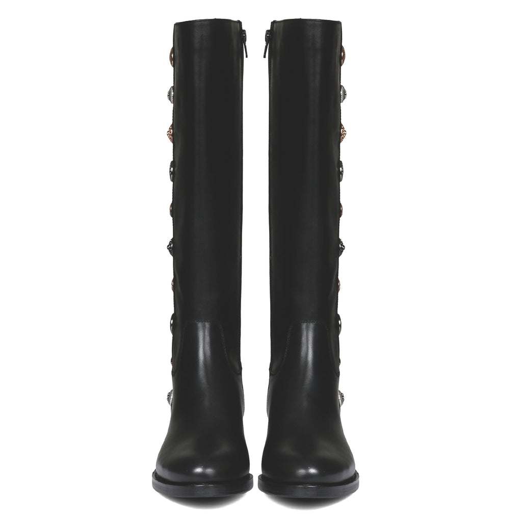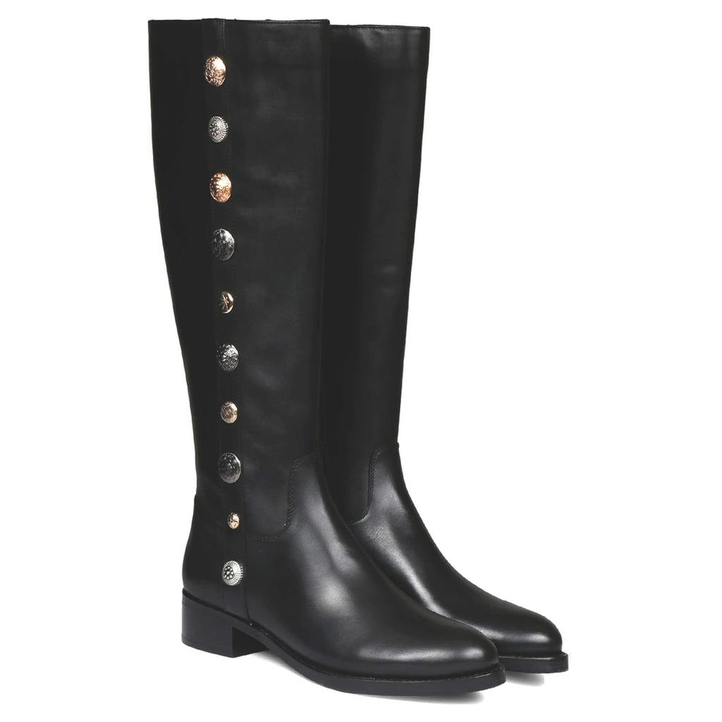 These Saint Adriano black knee high long boots are crafted from 100% genuine leather, decorative with gold and gun metal buttons, fleece and leather lining for a luxurious feel, padded leather footbed provides lasting comfort. has a rounded toe, an inside zip closure to ensure comfortably slip them on and off. These great-looking decorative boots feature a classic western style that can take you from a casual date to a night out with friends. These premium quality leather boots are constructed using an anti skid handmade tunit sole which ensures that you do not accidentally fall on any surface. Fitted on a low block heel.