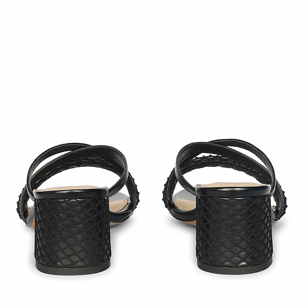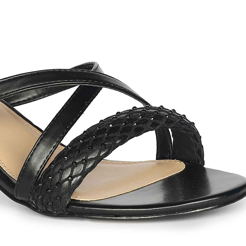 Crafted in soft black vegan leather, the crossover straps shimmer with delicate crystal accents that catch the light with every step. The block heel, wrapped in a textured, quilted pattern, adds depth and dimension, making this pair as sculptural as it is sophisticated. Designed for evenings that call for subtle glamour,