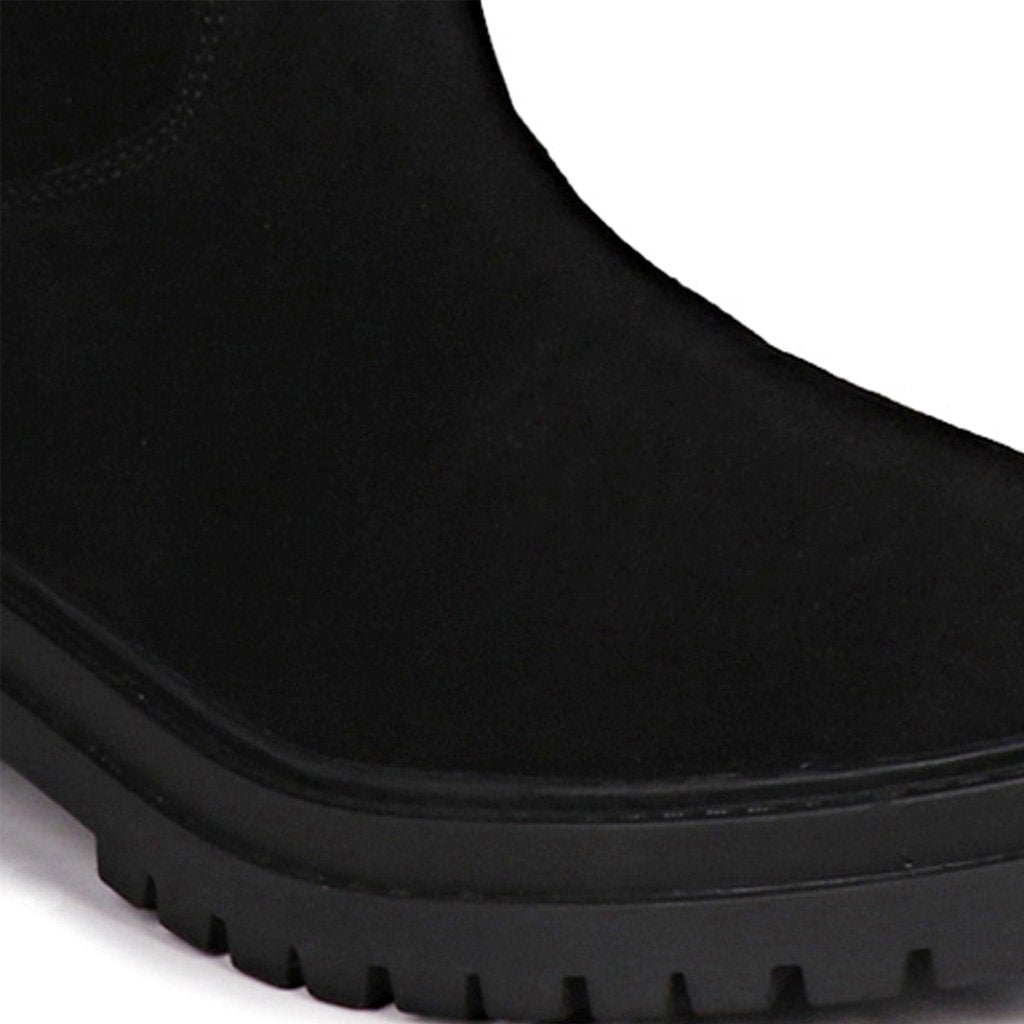 A pair of Saint Alexandra black suede leather calf boot features stitching details with paneled finish, a rounded toe and leather loop both side on top. This top-notch suede leather boot by SaintG will keep you looking stylish all year long. Complete with black leather lining, padded leather footbed and a slip-resistant black TPR sole provides superior grip on various surfaces. A low heel makes this boot a stylish choice for any occasion