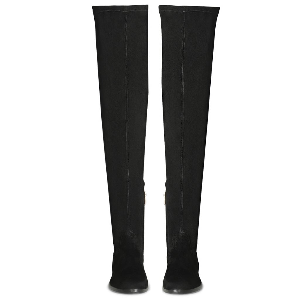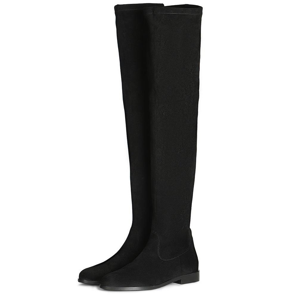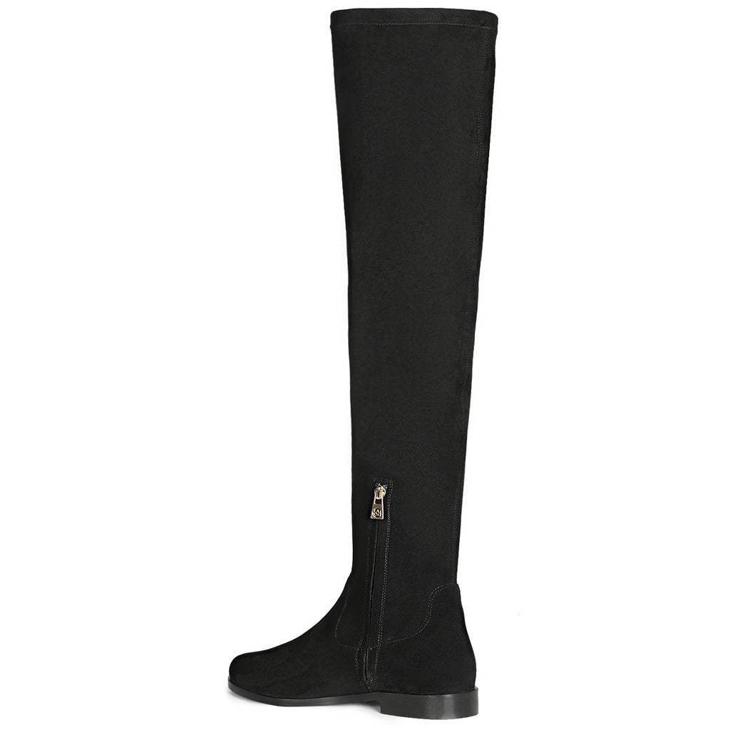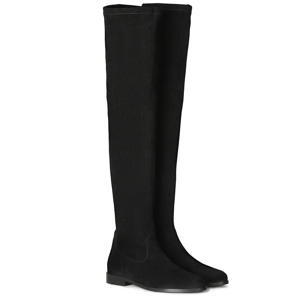 Complete your edgy style with these above the knee stretch suede riding boots. Featured round toe, stitching details, paneled finish with a round toe and low heel. Side zipper closure for easy on/off. Finished with leather insole and leather lining. The approx. height of the boot is-24.5 Inches.