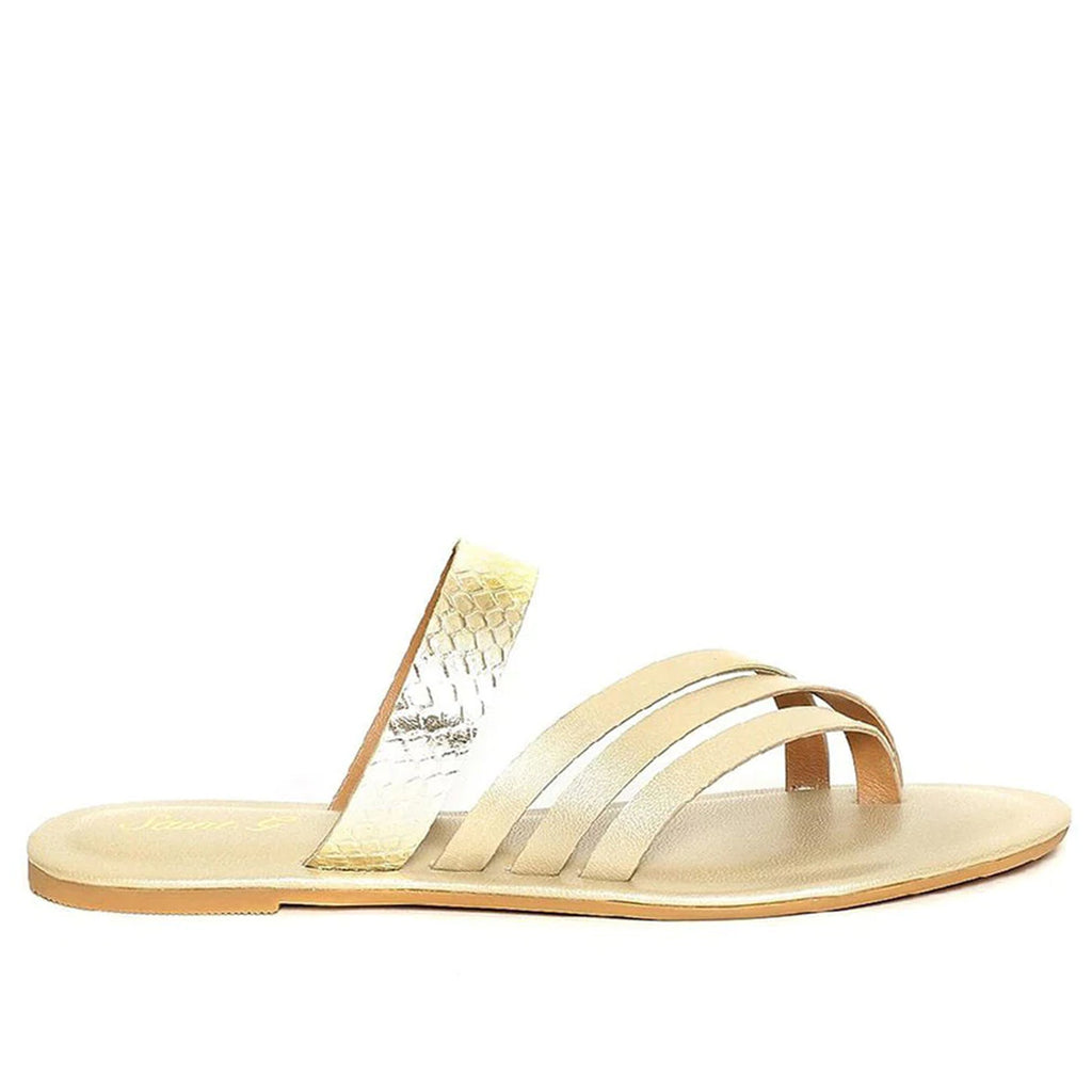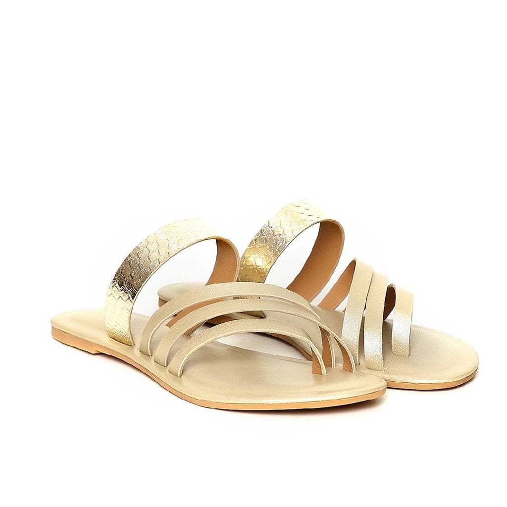 These textured gold and beige multi strap flat by the SaintG are handcrafted in leather and feature a slip on style, these decorative strappy design complete with padded leather footbed, leather lining and tunit sole. has a slip on closure. Crafted from genuine leather.
