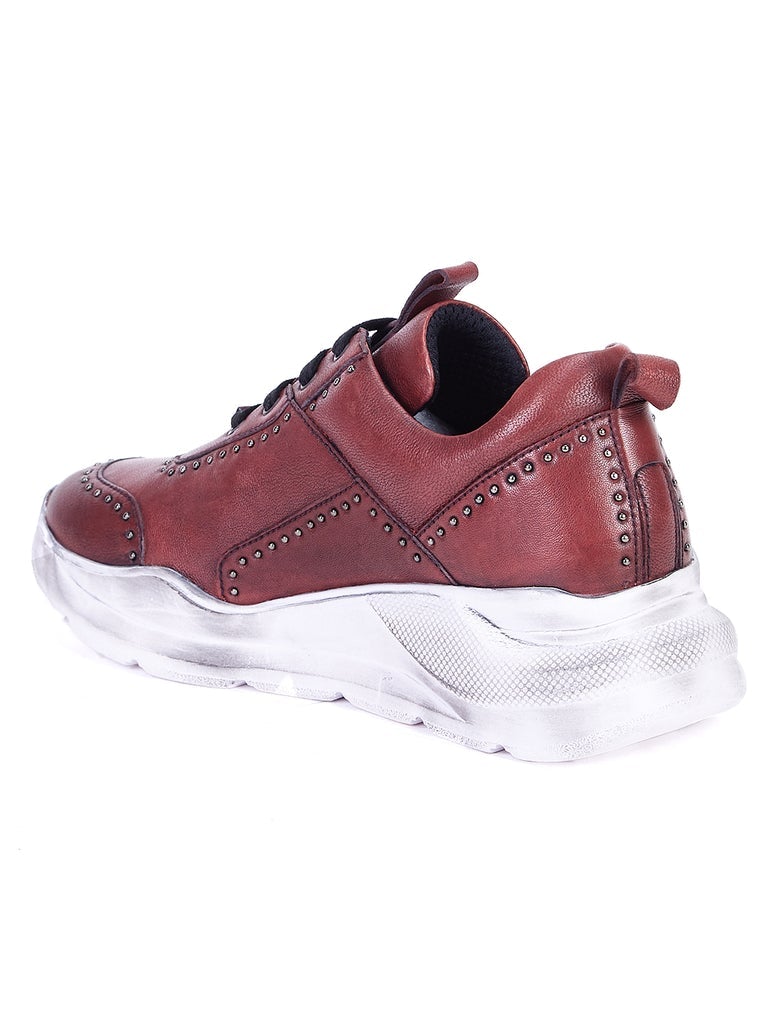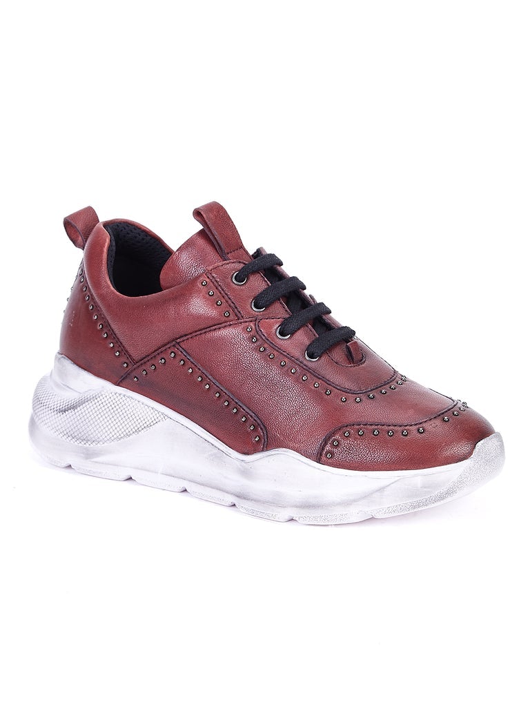 A pair of round-toe red sneakers, has regular styling, lace-up detail. embellished with studs. Light weight Eva sole.
