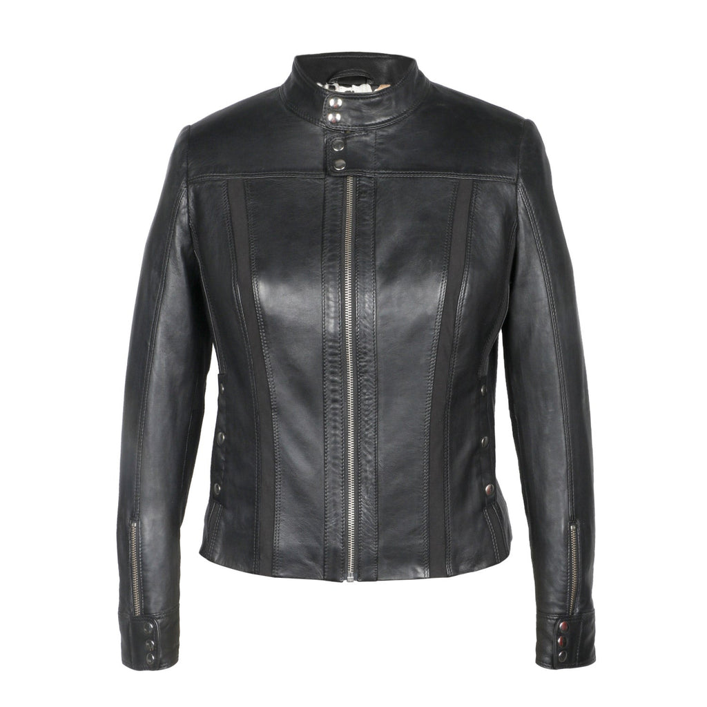 Saint Amaya, a 100% black genuine leather handcrafted into an outer shell creates an impressive look that will make heads turn! Inside, printed silk stain sewn with precision envelops you in comfort. A zipper closure and snap collar with buttons offer easy, adjustable wear, while open hem zipped cuffs give a modern feel. Two functional button pockets and a pocket inside add practicality.