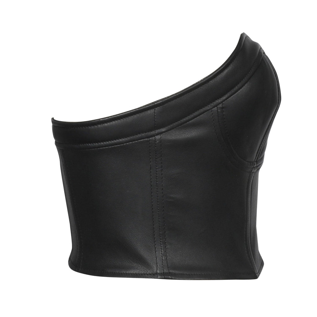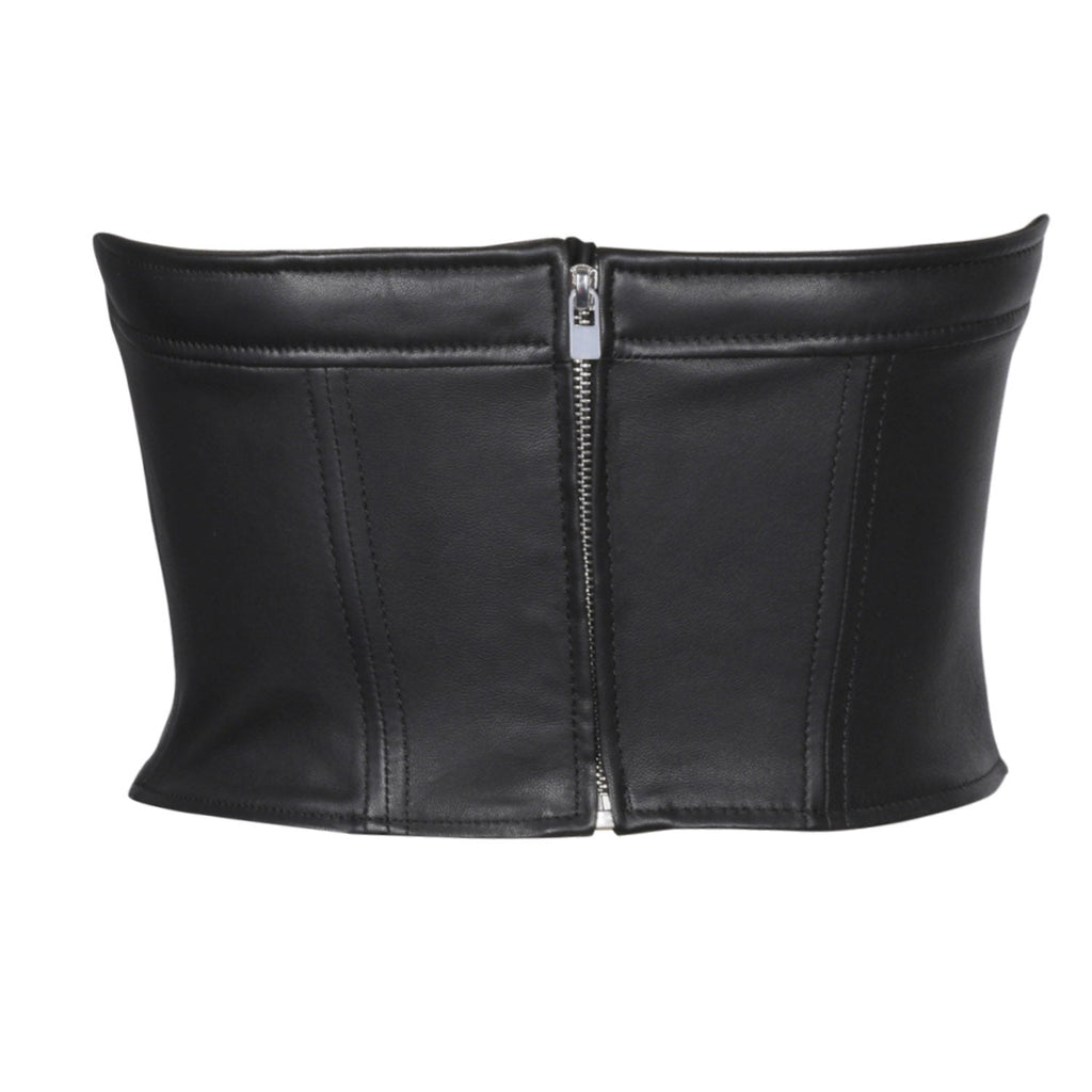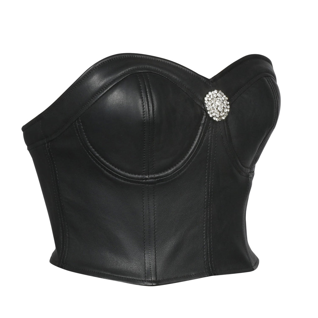 Refine your evening wardrobe with this black leather bustier from SaintG. Crafted from soft leather with a back zip closure and crystal embellishments, add a dose of glamour to any look. Perfect for special occasions.