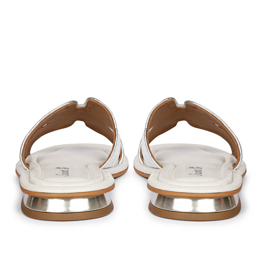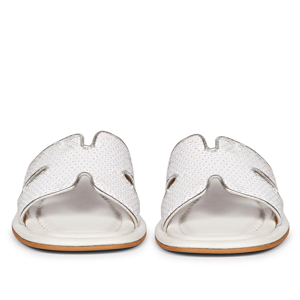 Show off your summer styling with our radiant accessory flats. Step into paradise with our white leather slides! The sequin embellished leather and low heel add playful details. Perfect addition to any summer outfit!