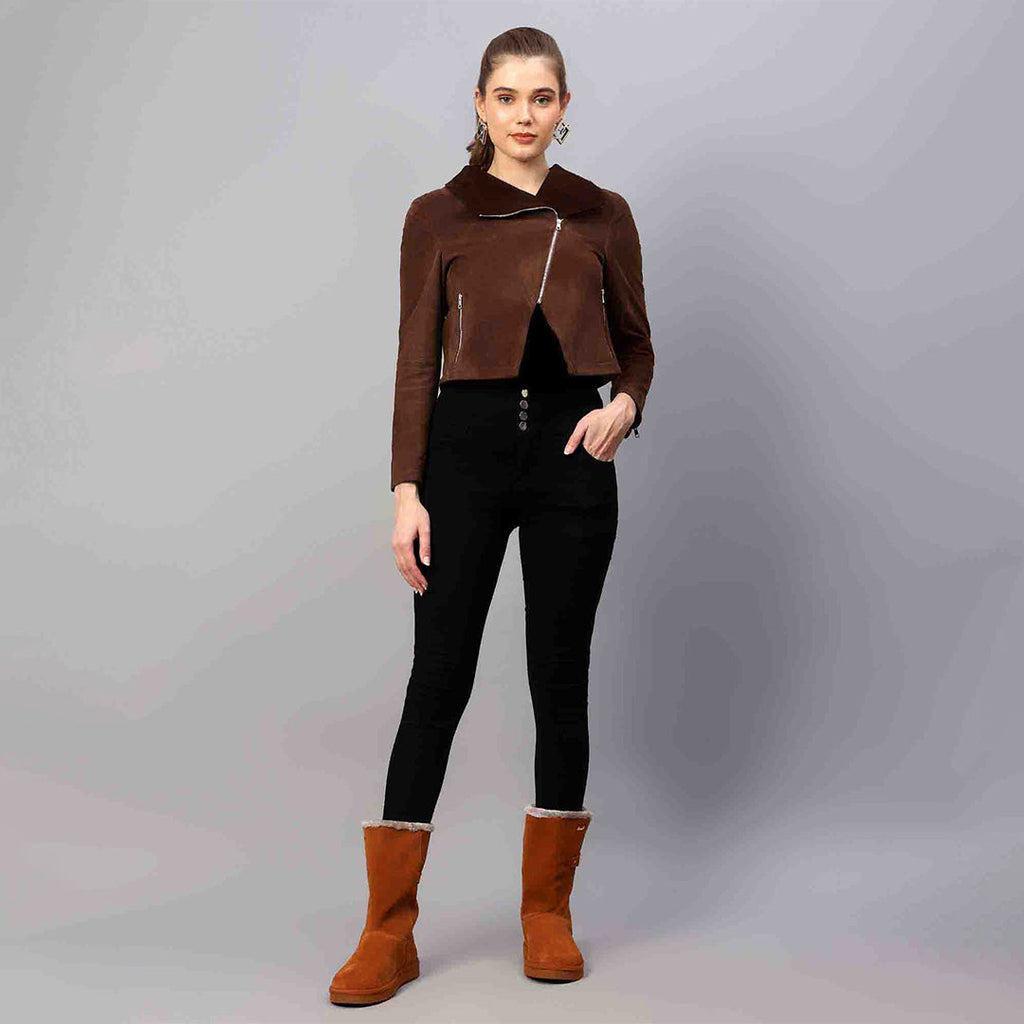 Unleash your adventurous side in the Saint Rebecca Women's Jacket, crafted with brown suede leather upper, soft cotton lining and taffeta-lined sleeves, and a zipped closure. Make a statement with the spread collar and open hem cuffs, plus two functional zipped pockets and one inside pocket to keep valuables safe. Zip up and show off in style!