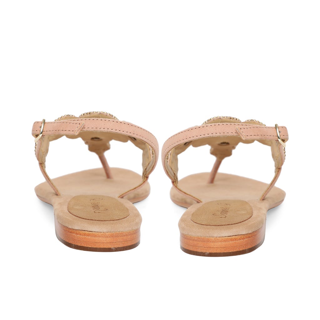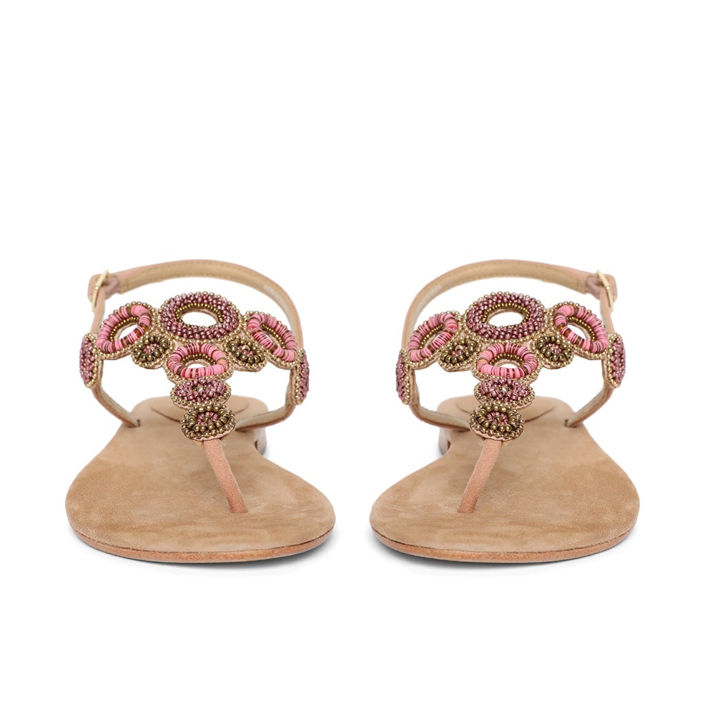 A pair of decorative hand embroidered nude leather flat sandals, Its secured with buckle fastening leather strap. has a leather lining, suede leather padded insole and leather sole. Made from finest material and quality products.