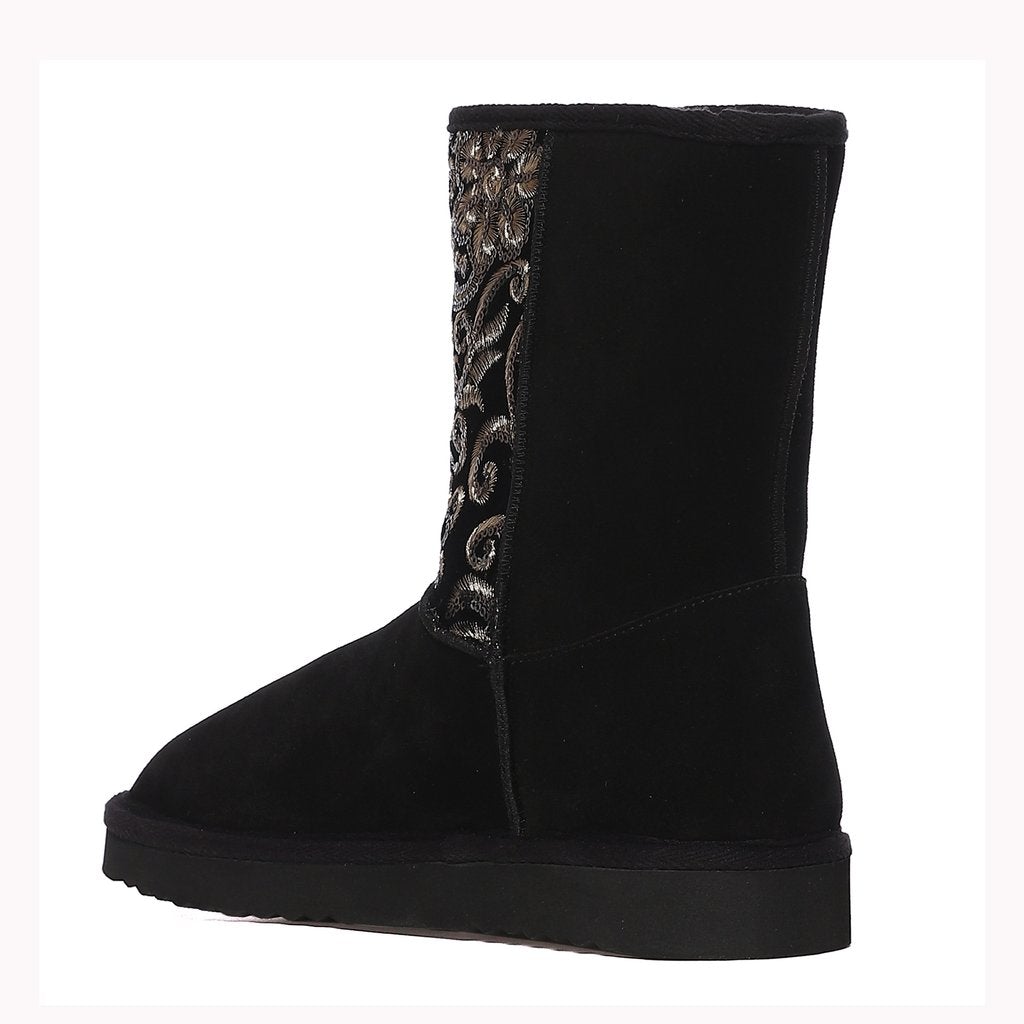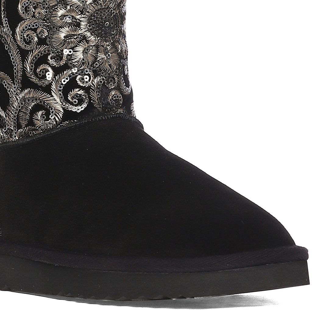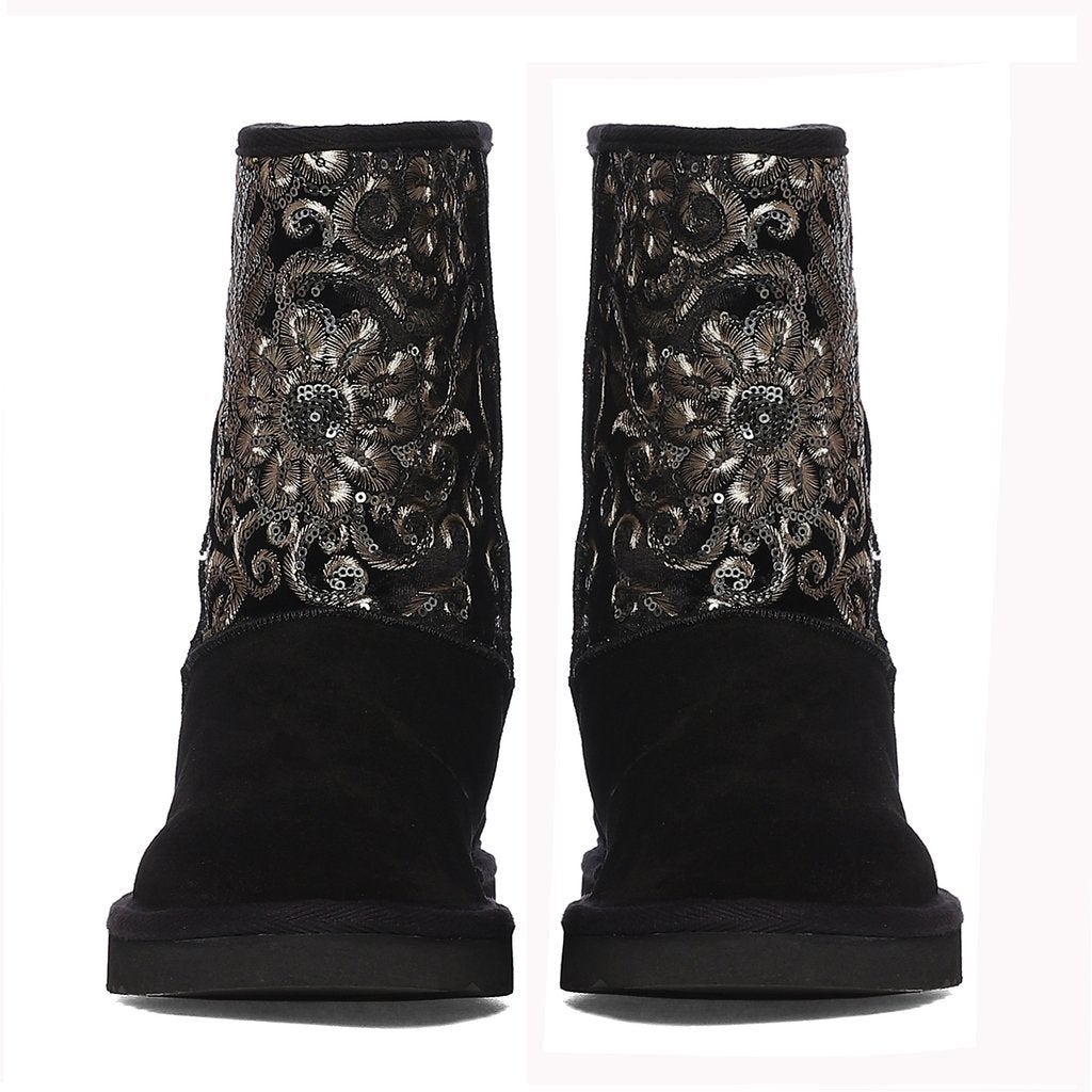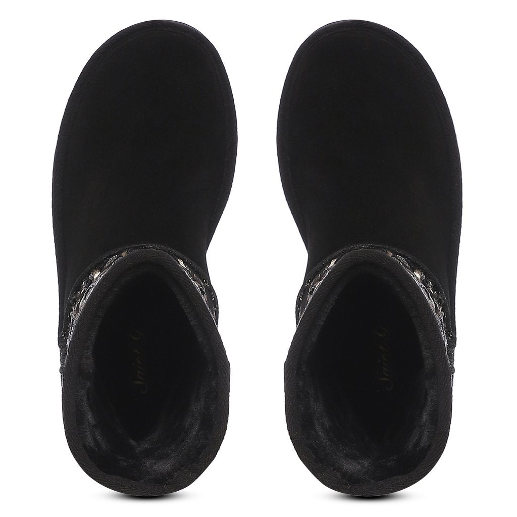 Grow your stylish wardrobe with a pair of trendy snug boot from SaintG. This black hand embroidered sequins fabric boot looks best with any winter outfits.