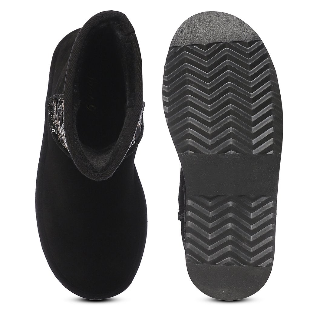 Our Saint Corah snug boots are embellished with luxuriant black sequins over an embroidered suede leather. These snow boots are designed with fur lining and fur insole to keep your feet warm while you have fun. Enjoy your step with super comfortable & flexible rubber sole.