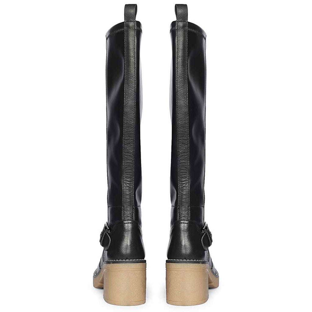 A sculpted silhouette in smooth leather, balanced with stretch back panels and sealed by a gleaming silver buckle, boots that command attention while moving with effortless grace.