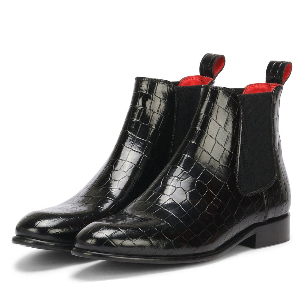 Handcrafted Leather Shoes:- A pair of handcrafted black croco patent shiny leather chelsea boot, has a slip on closure. Featuring leather pull tab and elasticated side panels to ensure comfortably slip them on and off. Its complete with leather lining and padded leather insole. The slip on boot sit on a hand finished leather sole, nailing on top lift.