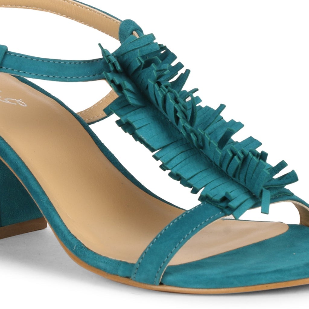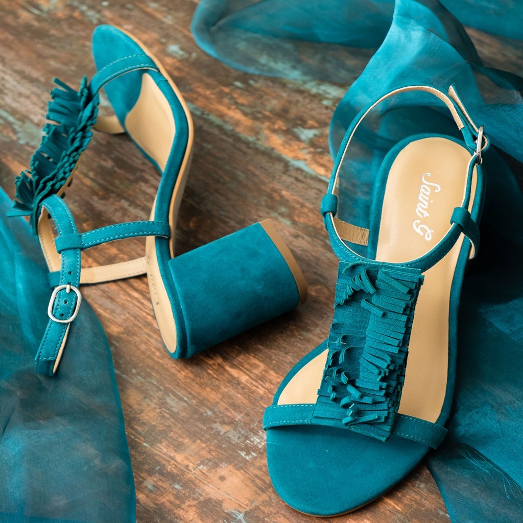 Elevate your everyday style with the handcrafted blue suede leather with fringed panel, leather footbed, leather lining, buckle fastening strap, suede leather covered block heel.