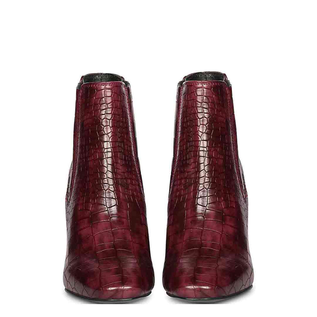 Meet Saint Edwina, A classic handcrafted croc embossed burgundy vegan Leather ankle boots with 3 Inches covered block heels, has a slip on closure. Featuring leather covered elasticated side panels to ensure comfortably slip them on and off. Its complete with leather lining and padded leather footbed.