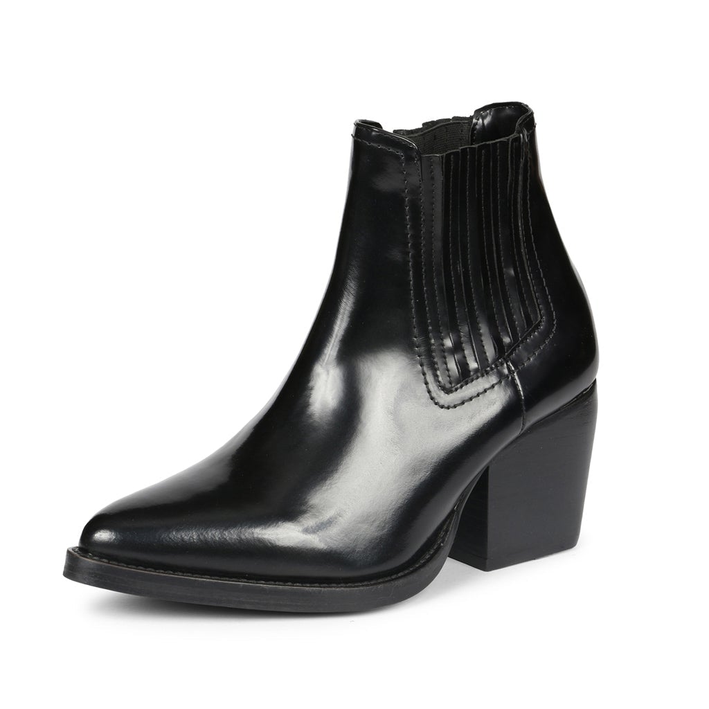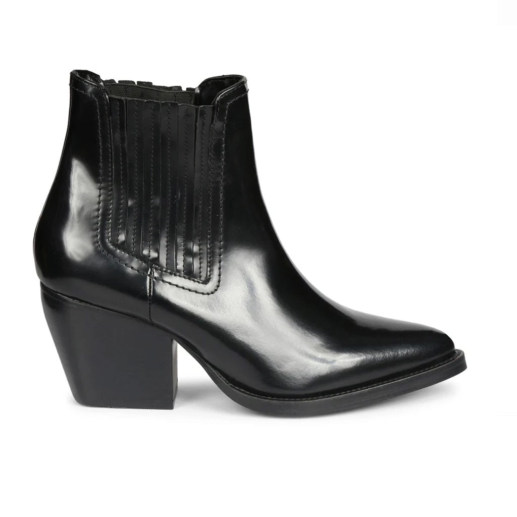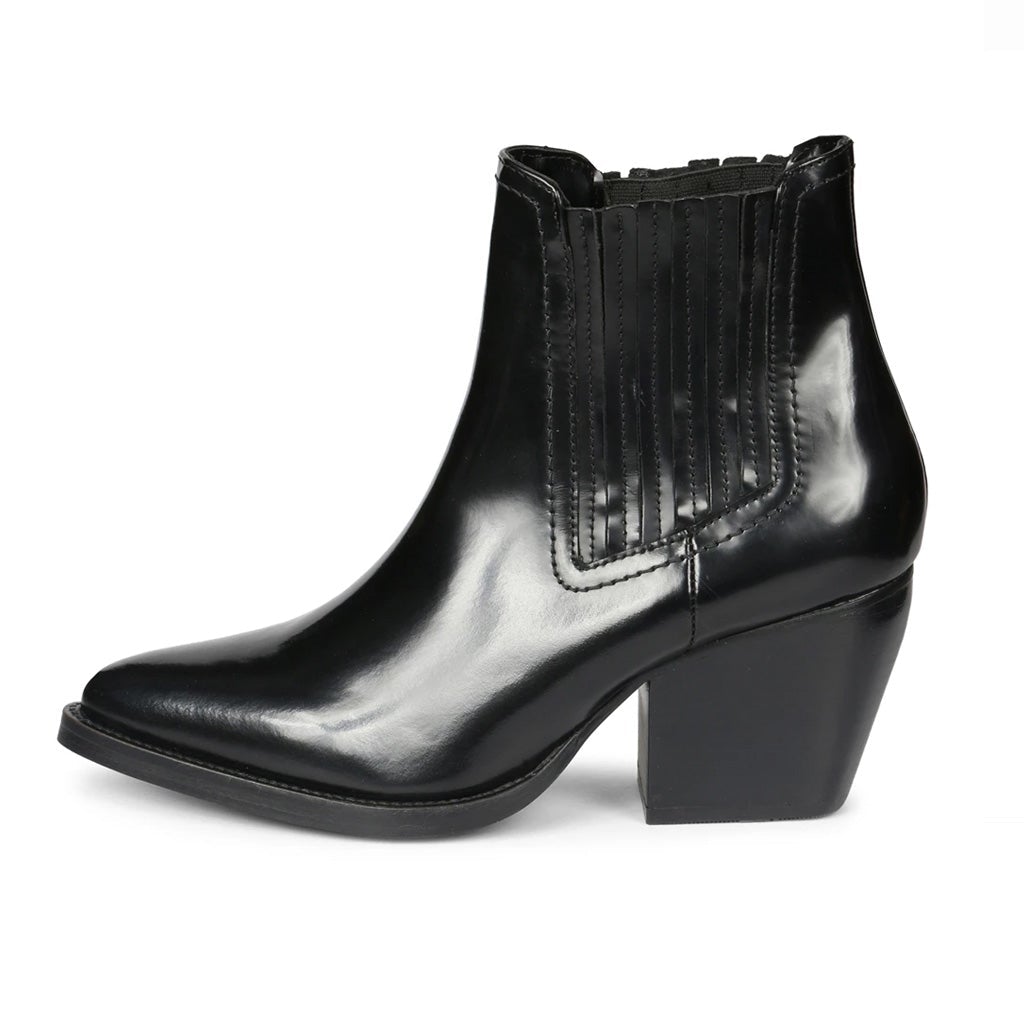 A pair of handcrafted black patent leather pointed toe boot, Featuring leather covered elasticated side panels to ensure comfortably slip them on and off. Its complete with leather lining and padded leather footbed. The slip on boot sit on a stacked heel.