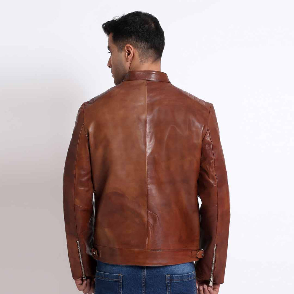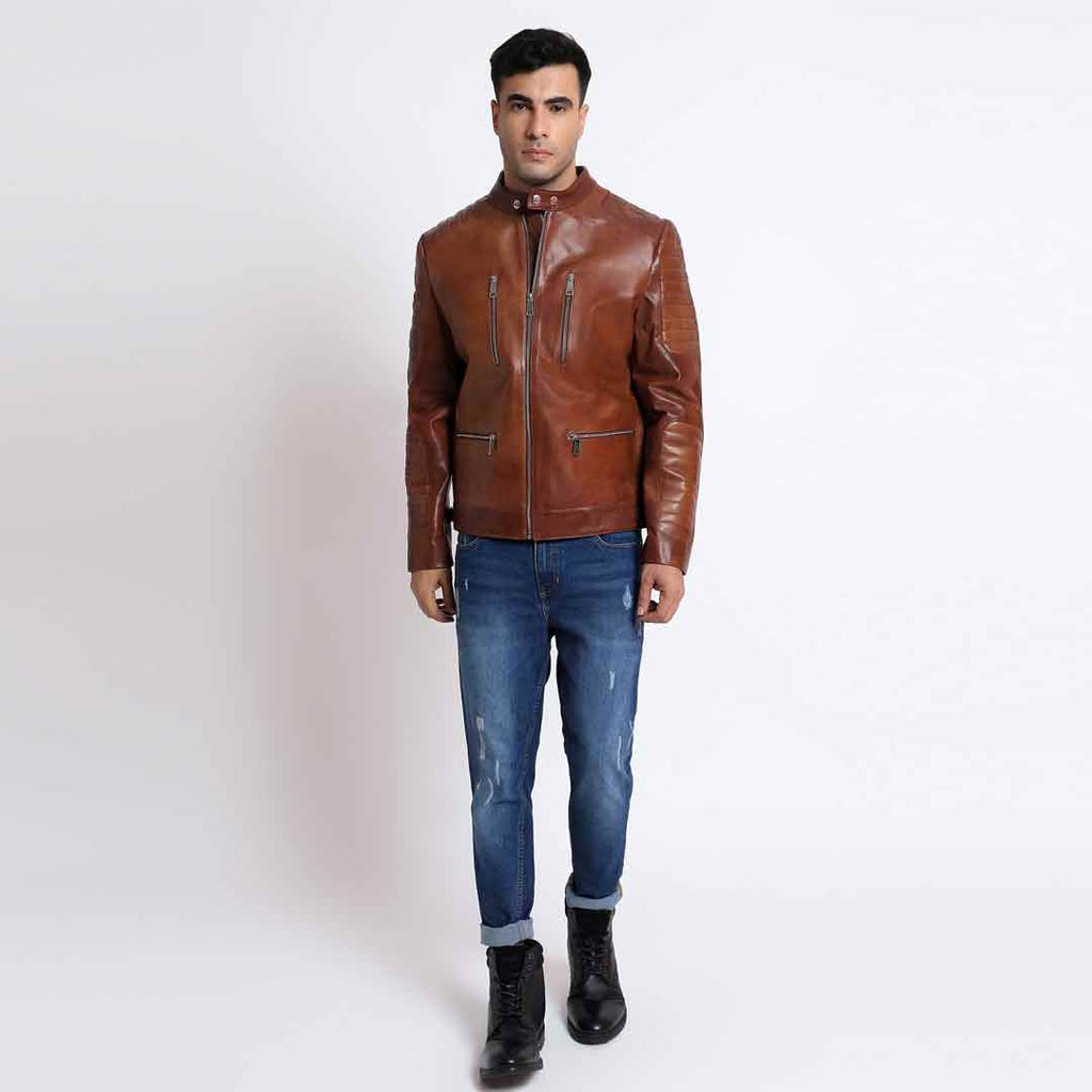 This Ellis burgundy leather jacket will have you ready to take on the world in style! Crafted from genuine leather, with an eye-catching hand-painted finish, this jacket stands out. The inside lining is poly-satin and taffeta for added comfort and breathability, and the zipper closure and snap collar with button will keep you secure and snug. Add to that four zipped functional pockets and a single pocket inside and you'll find yourself looking good and feeling great! Let's go!