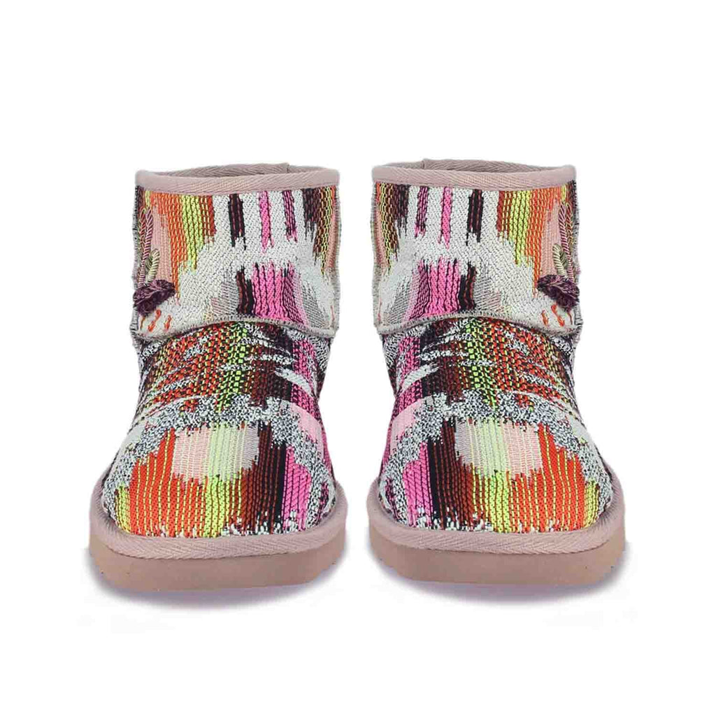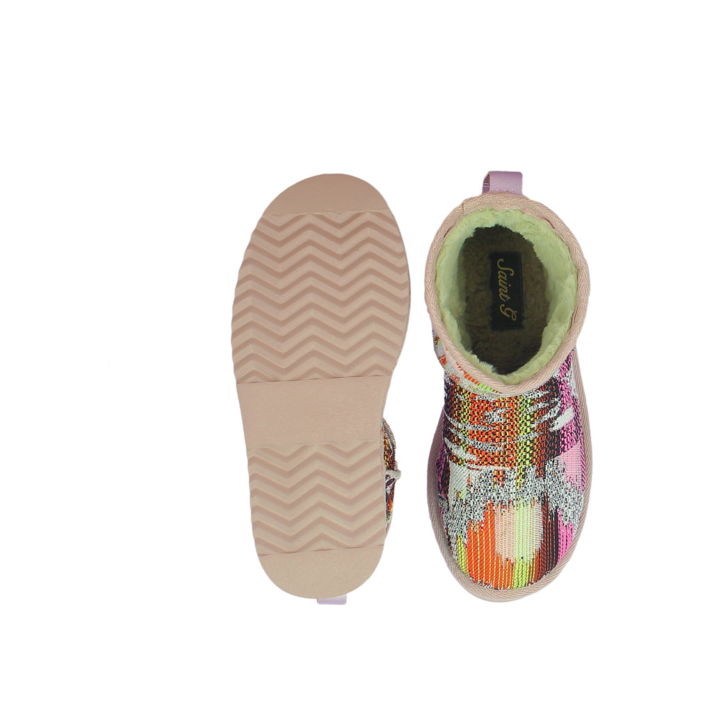 These SaintG snug boots are crafted from floral embroidered fabric upper with fur lining and fur insole to keep your feet warm while you have fun. Enjoy your step with comfortable rubber sole. has a leather pull tab at back to easily slip on and off