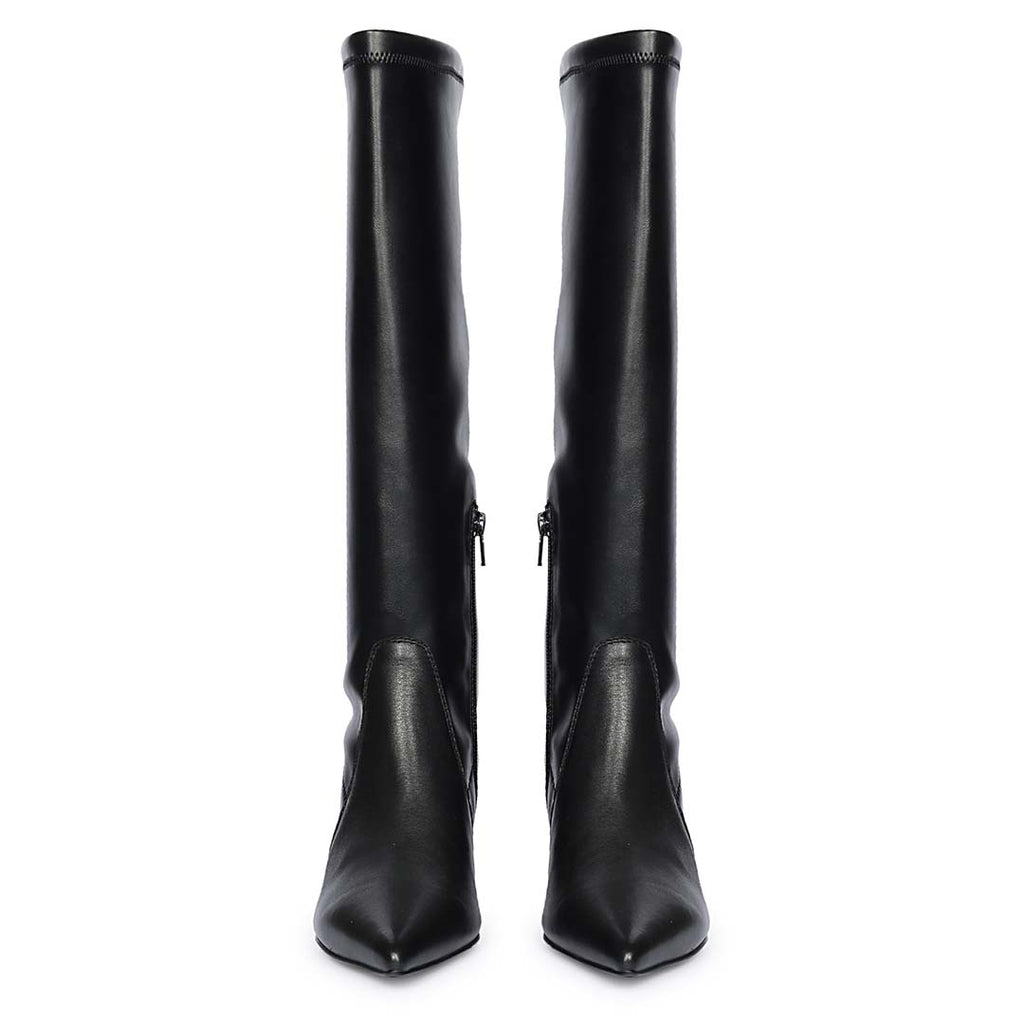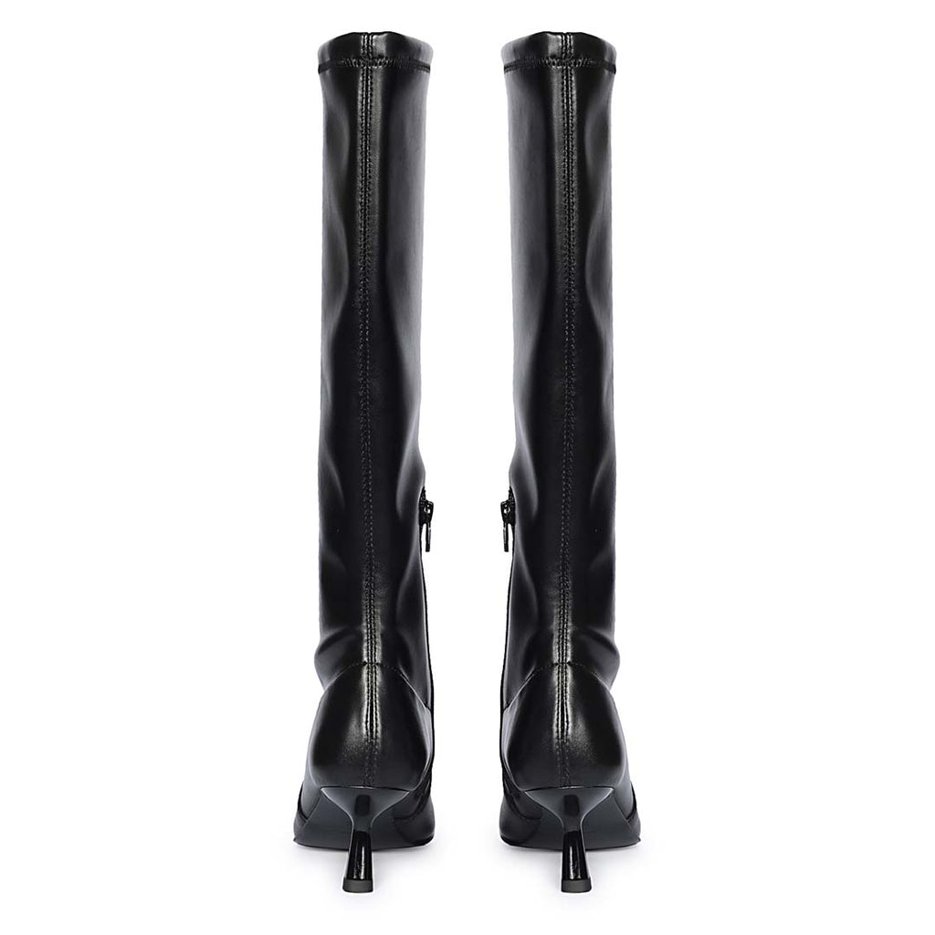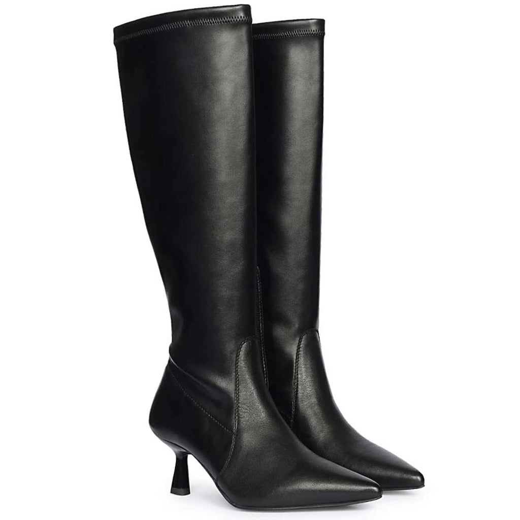 Sharp lines, soft stretch, and a pointed toe that means business. Set on a slim kitten heel, these boots slip on easy and walk with attitude, black nappa made for all-day style with a little kick.