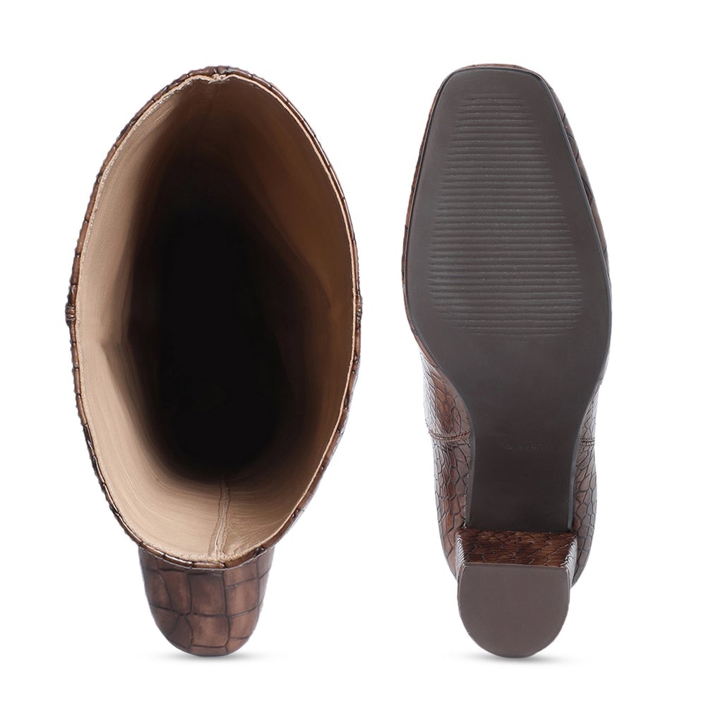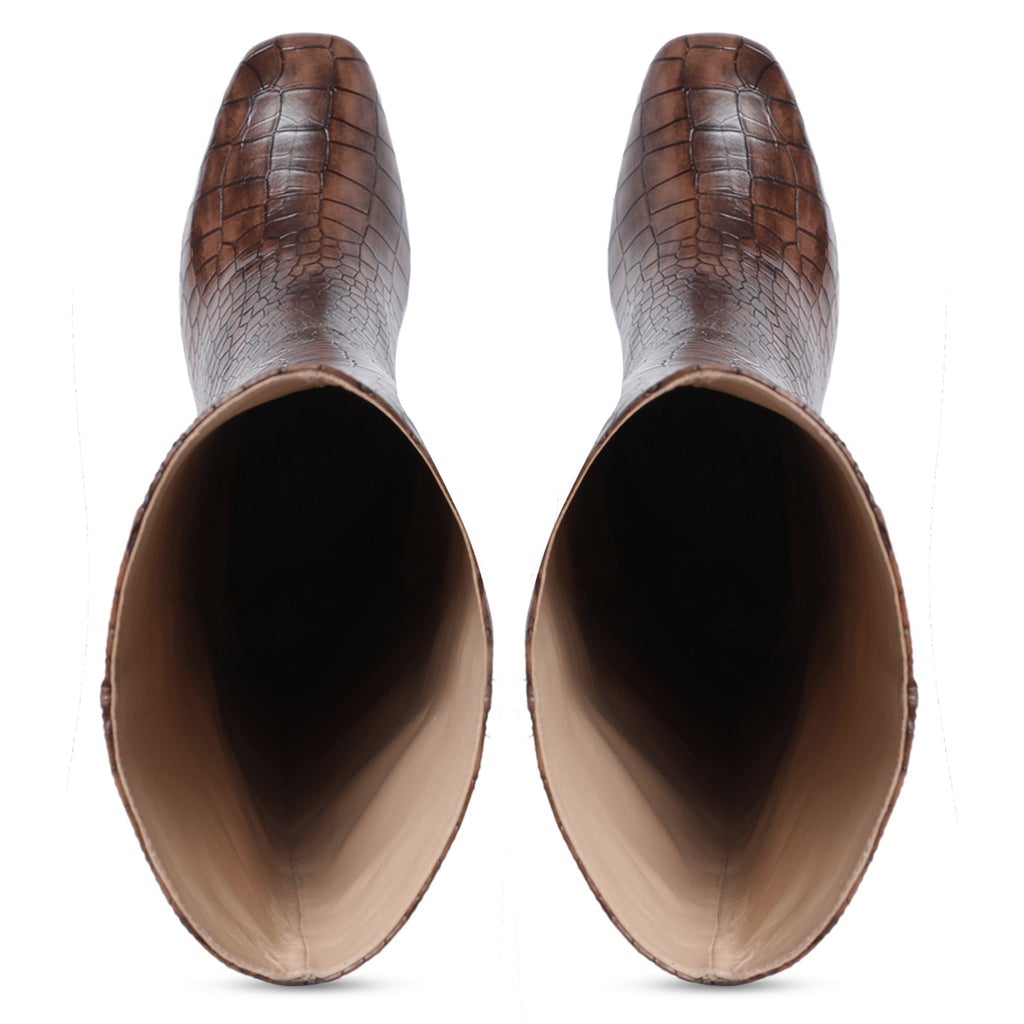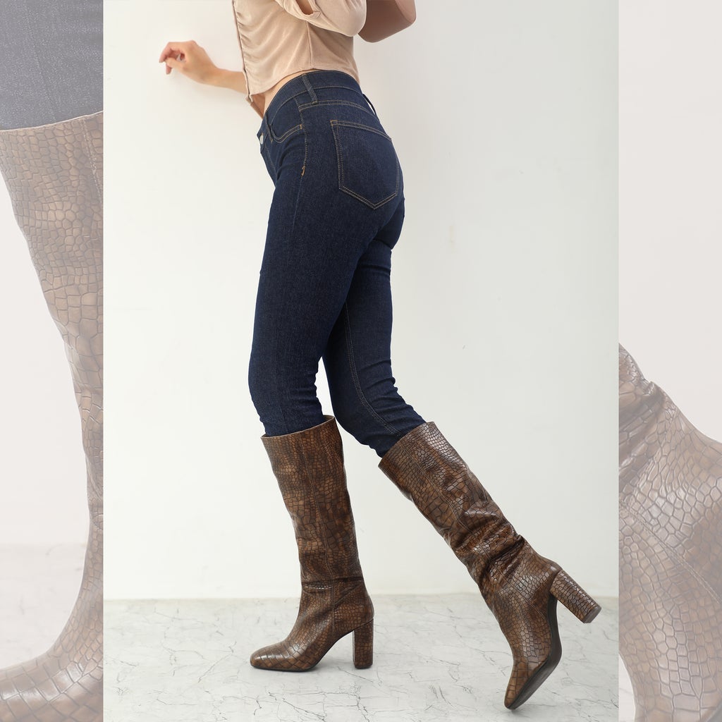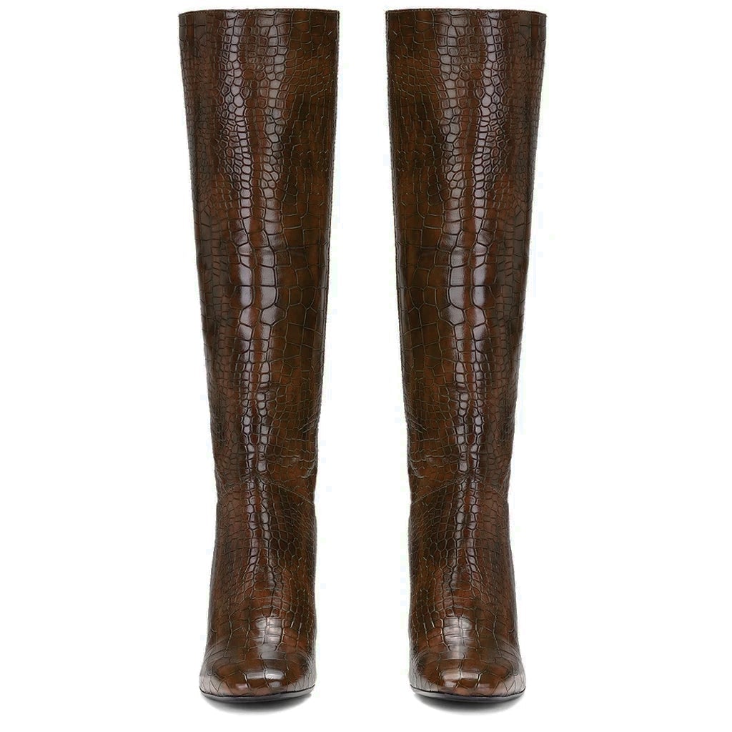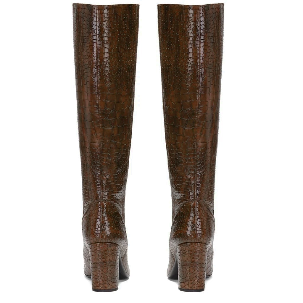 Meet Saint Emily, the new classic. Set the trend this season in these croco print vegan leather knee high boots from SaintG, these boots are sure to turn heads. Featuring knee high shaft, wide calf, a pointed toeline and covered block mid high heels. Full nude color sheep leather lined for a luxurious feel, cushioned leather insole provides lasting comfort. The slip on closure boot sit on a tunit sole.