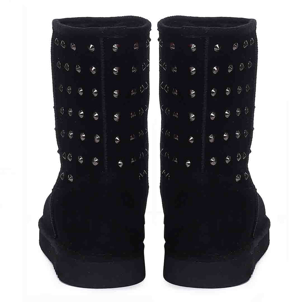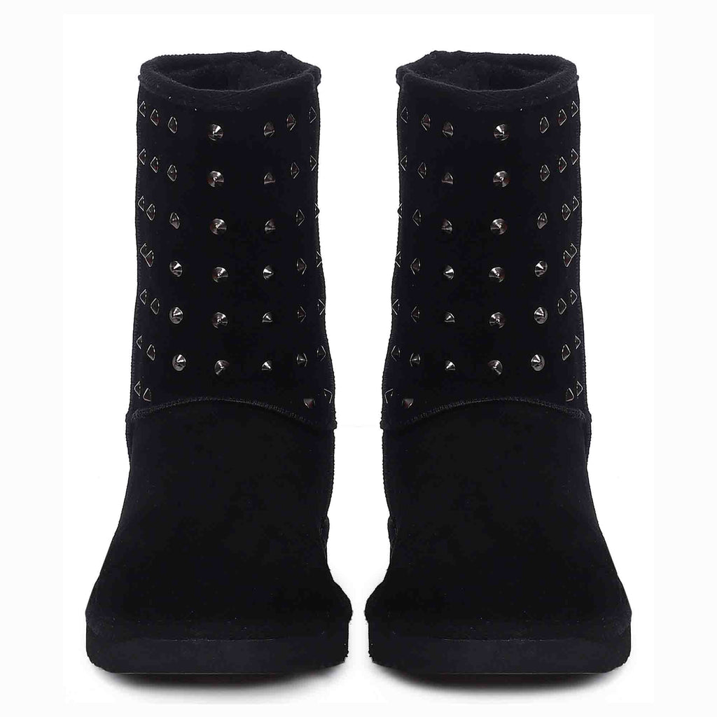 The dazzling, metal studded suede and fur boots will instantly give your winter look a fun party vibe. These snow boots are designed with fur lining and fur insole to keep your feet warm while you have fun. Enjoy your step with super comfortable & flexible rubber sole.