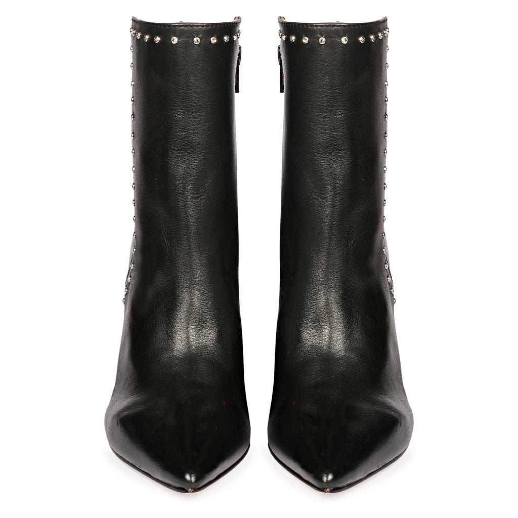 Walk a little taller in these beautiful Fia studs embellished ankle boots. These pointed boots are the perfect way to add a glamorous look to your everyday styling. Featuring studded crust leather upper, leather sole and inside zip closure to ensure comfortably slip them on and off. Completed with leather lining and padded leather footbed. The slip on boot sit on leather covered block heel.