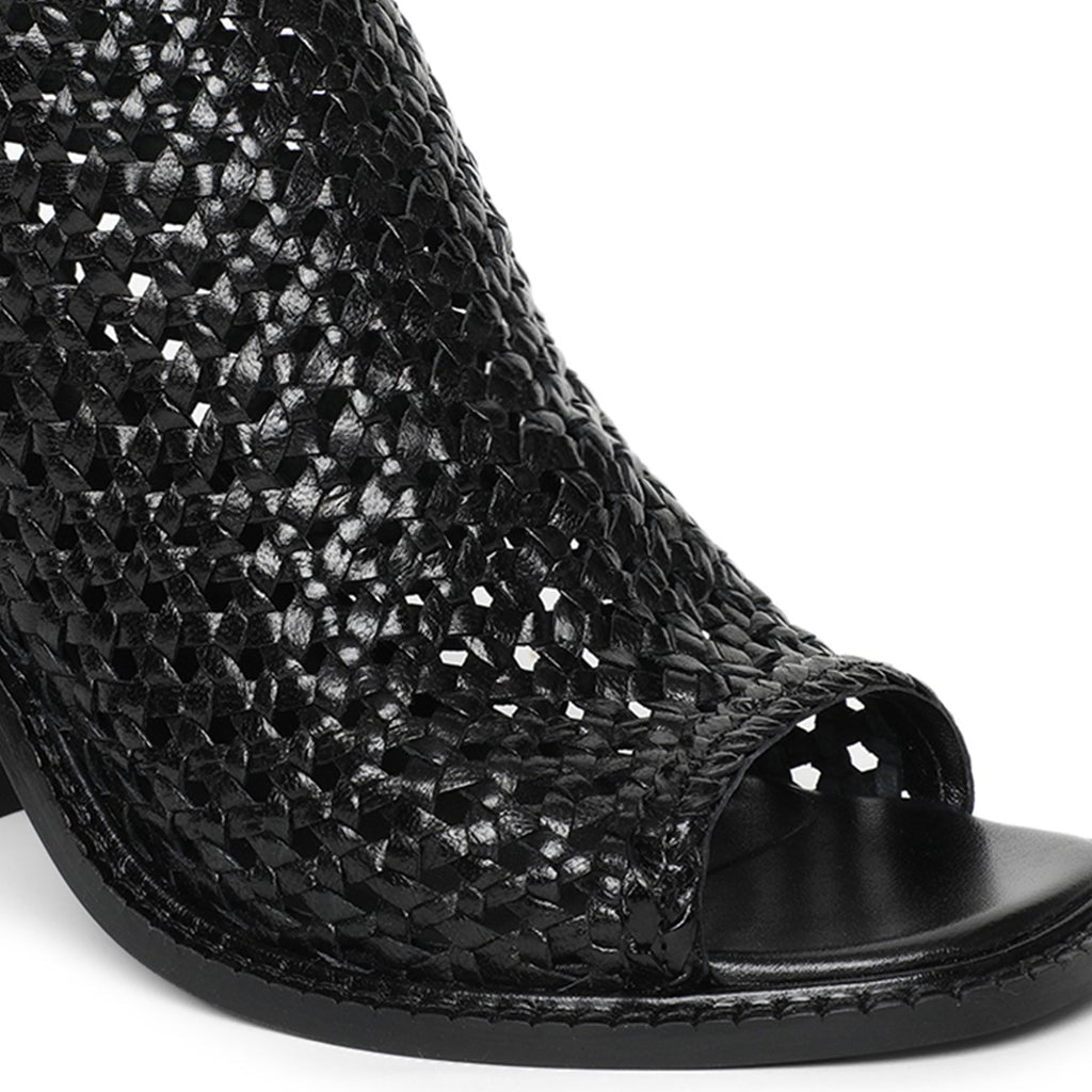 Step into the spotlight with this handcrafted woven leather mule from SaintG. This caged design comes with an open toe and a veneer leather covered block heel and padded leather sock allow you to wear the latest styles in lasting comfort. It's comes with back zip fastening. Made perfectly with the finest material and quality products. Our women’s footwear promise a chic wear with every outfit in your wardrobe.