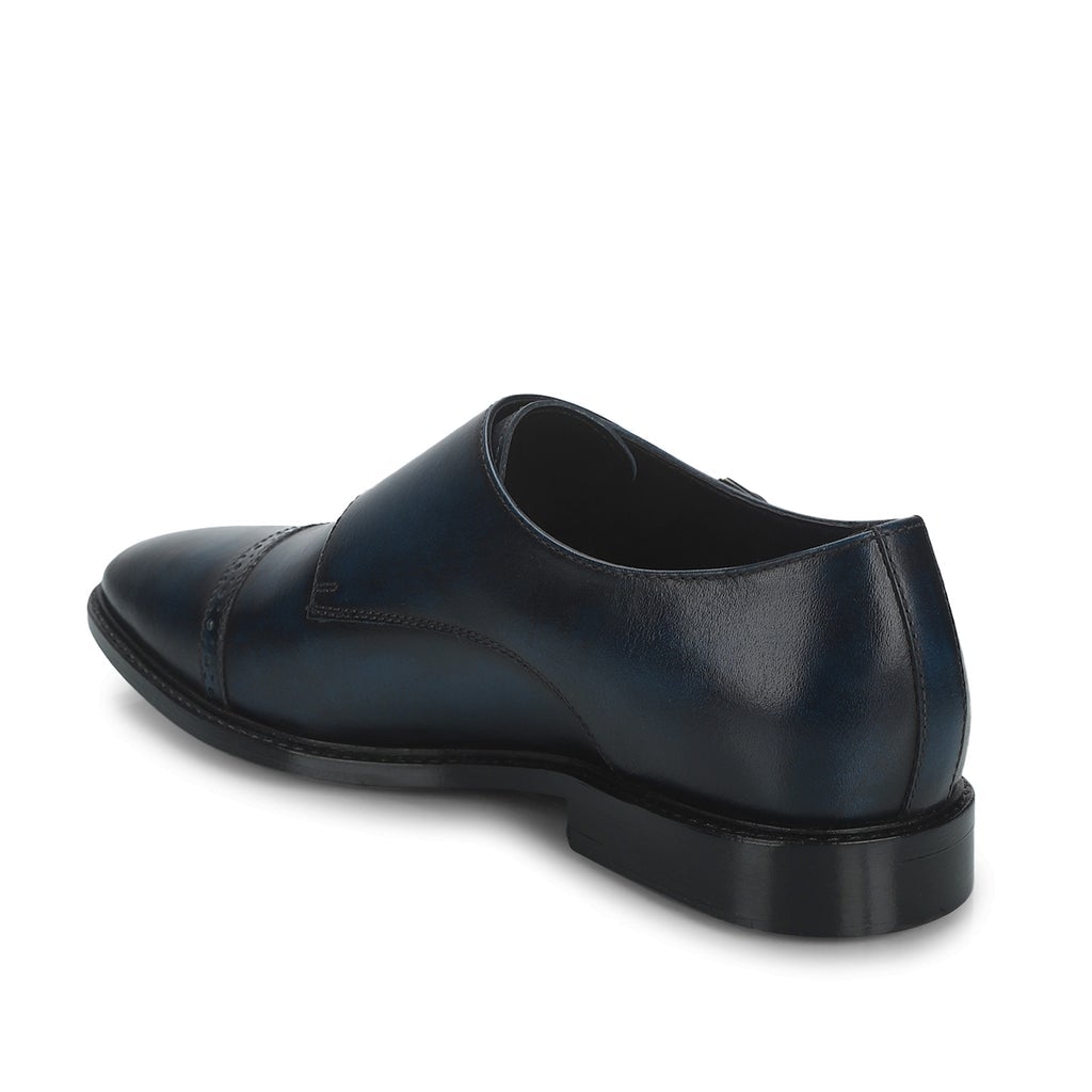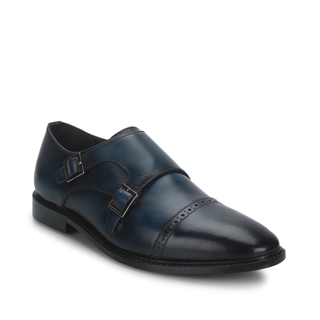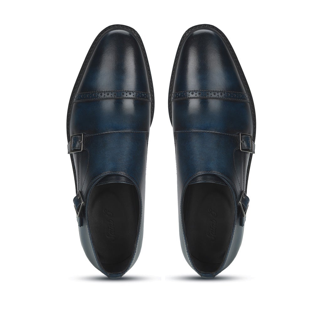 A pair of handcrafted blue leather double buckled monk strap brogues. Its complete with soft leather lining and padded leather insole for comfort. has a anti skid tunit sole for class and durability, has a 6mm welt.