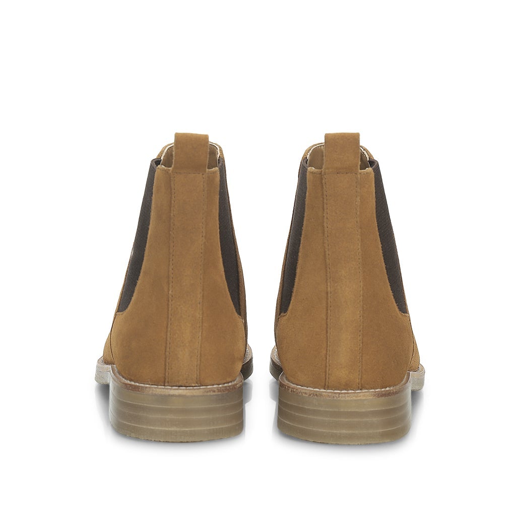 A pair of handcrafted tan suede leather chelsea boot, has a slip on closure. Featuring leather pull tab and elasticated side panels to ensure comfortably slip them on and off. Its complete with leather lining and padded leather footbed. The slip on boot sit on a crepe sole.