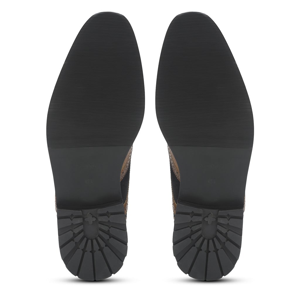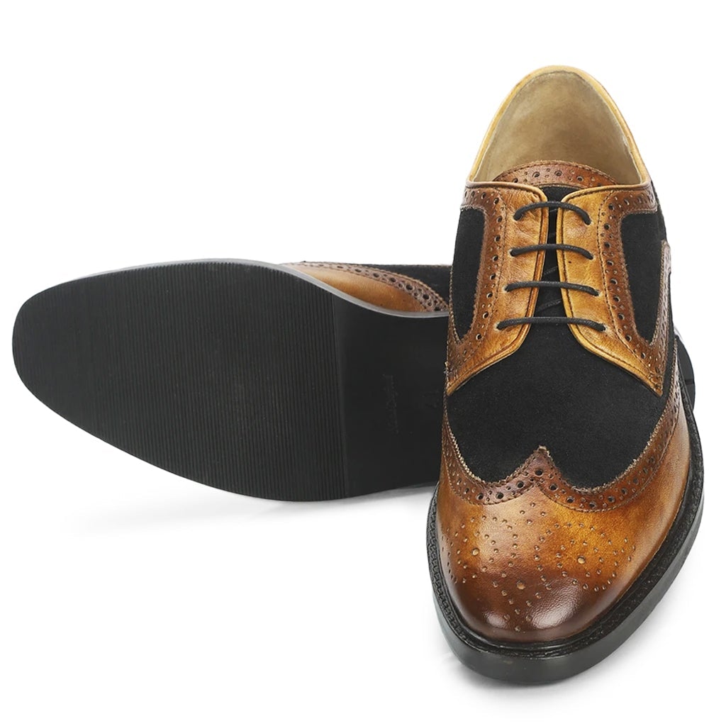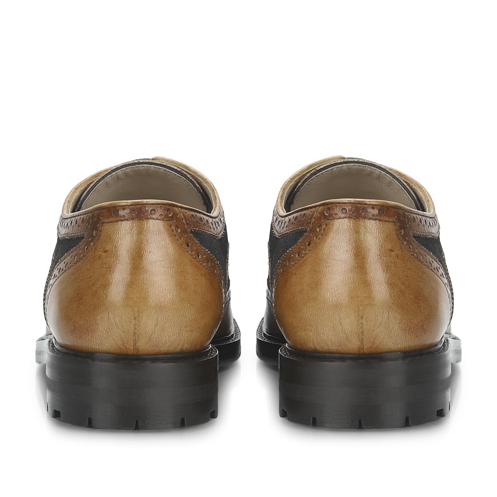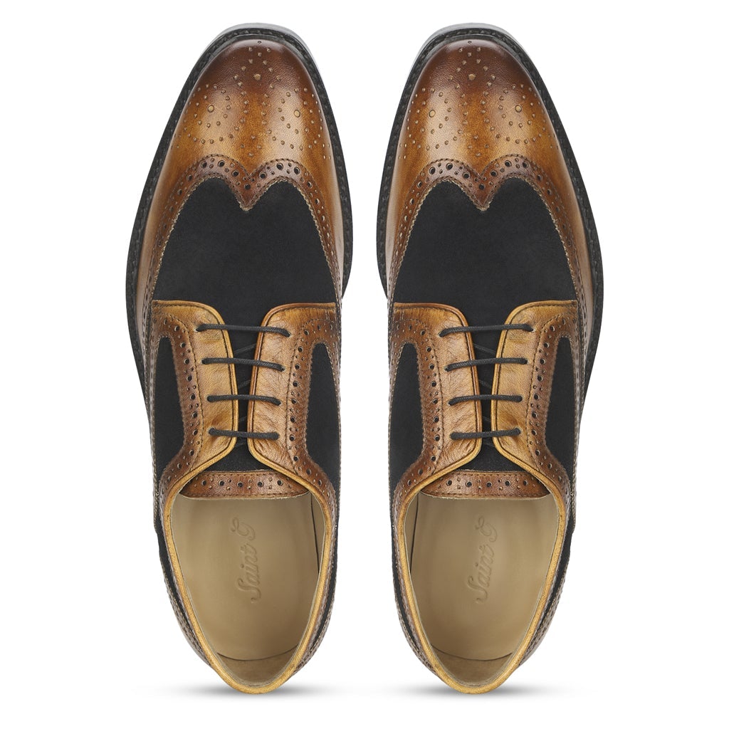 A pair of handcrafted tan leather lace up brogue. Featuring a navy suede side paneling, burnished finish to the toe and heel, cut design, lace-up fastening and decorative perforations. Its complete with leather lining and padded leather insole, has a anti skid tunit sole with 6 mm welt.
