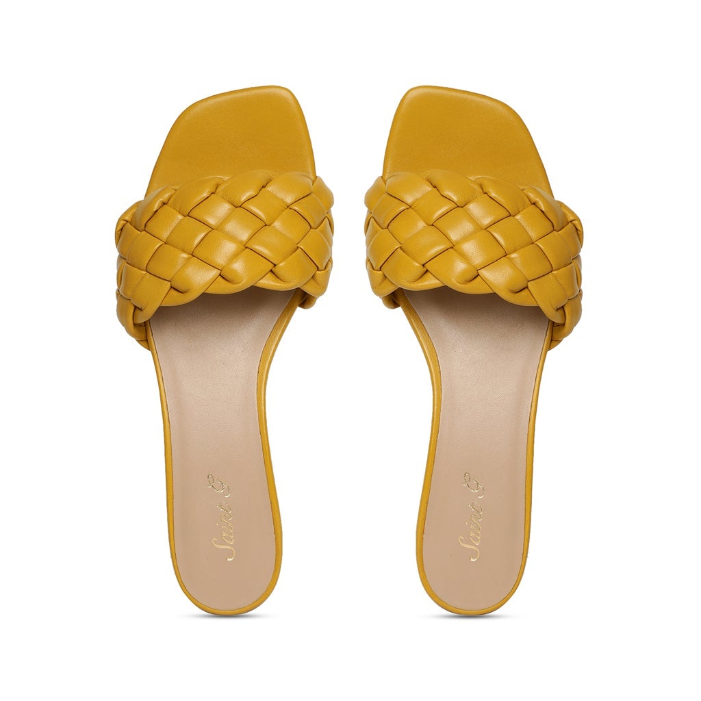 Grow your stylish wardrobe with a pair of soft cushioned hand woven mustard leather mid block heel from SaintG. A high-coverage mule featuring a statement woven strap and an elongated square toe and a short mid-heel. Woven features and a walkable heel make it so desirable. It comes with a veneer leather covered heel, full leather lining and padded leather footbed for natural comfort and breathability. This slip on heel will lend a stylish look to your outfit.