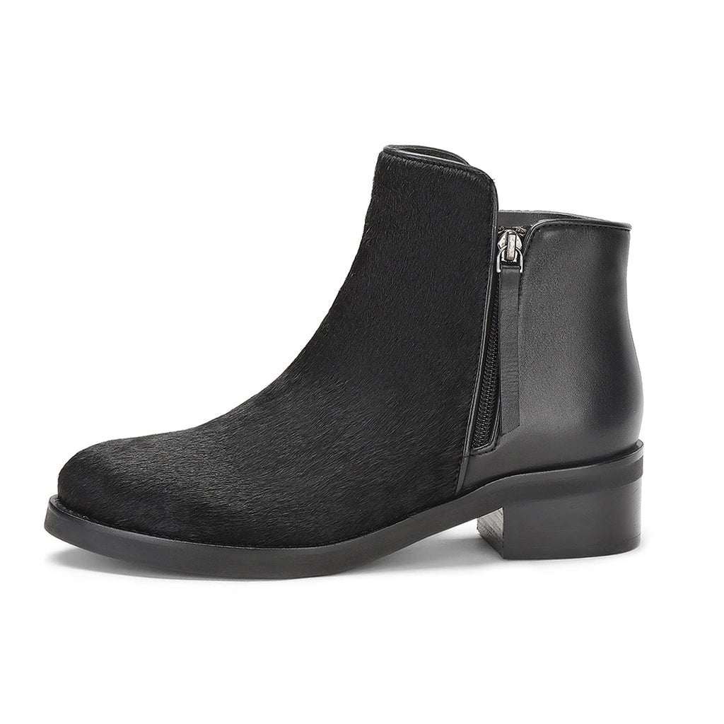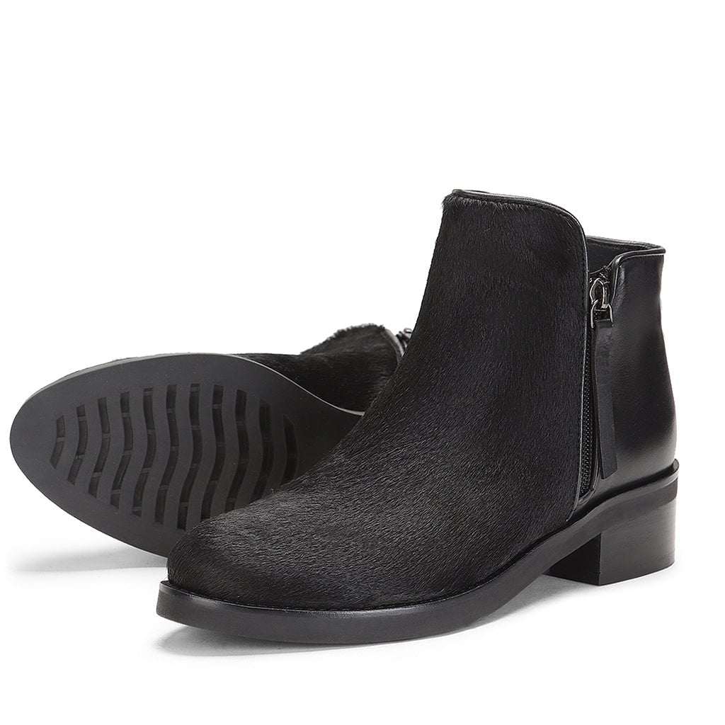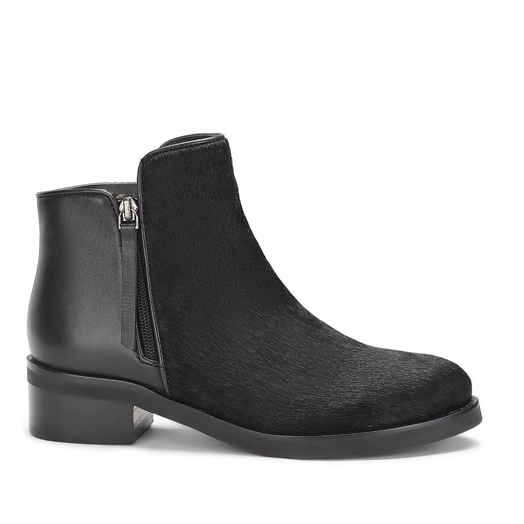 Saint Genevria High Fashion black pony hair/black napa leather handcrafted ankle boot, a side zip make them easy to wear.