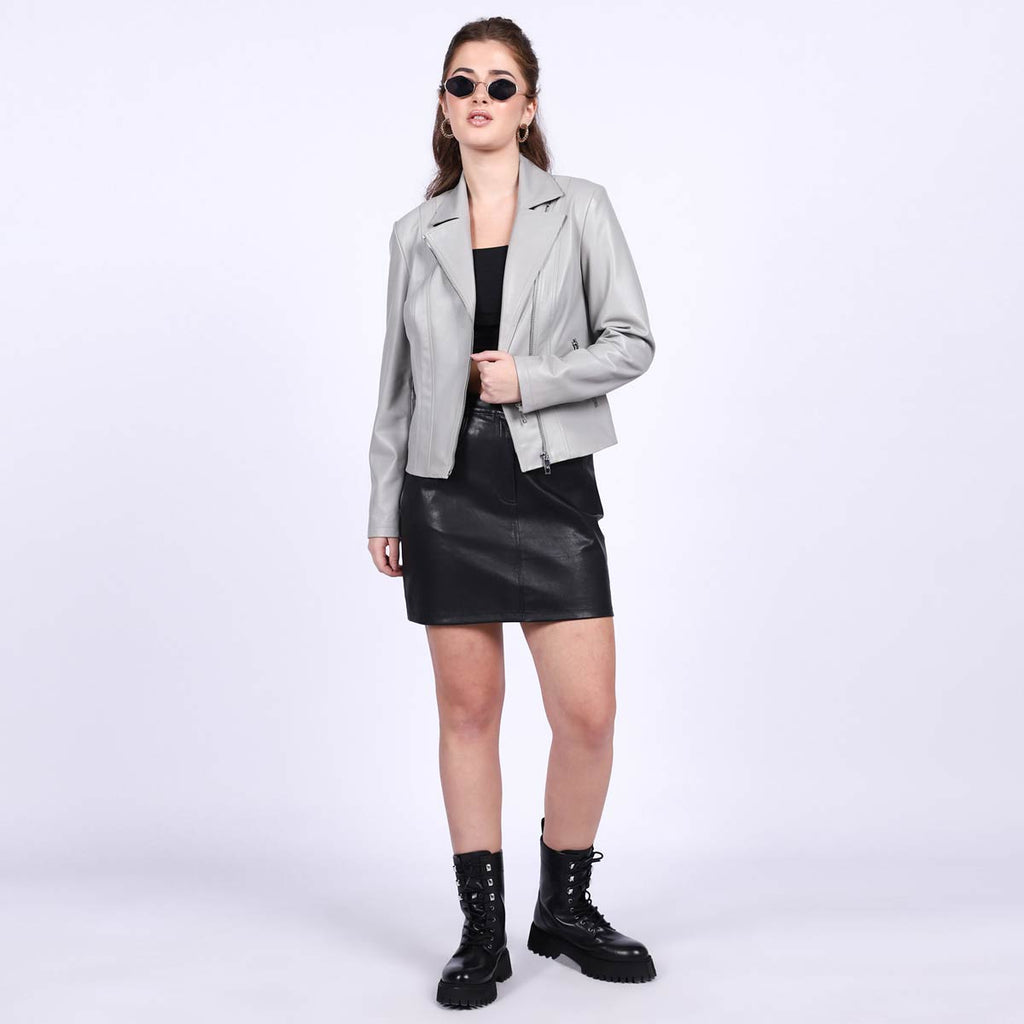 Our 100% leather Saint Ginevra Biker Jacket will be your go-to for handcrafted luxury. It features a grey Genuine glove leather outer shell, a cotton inner lining, a spread collar, open hems with zipped cuffs, and two functional zipped pockets. So stylish you'll be tempted to take a spin in it. Gear up, feel the power of adventure & set out on your next thrill ride!
