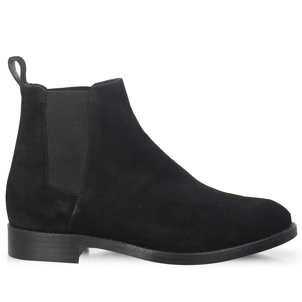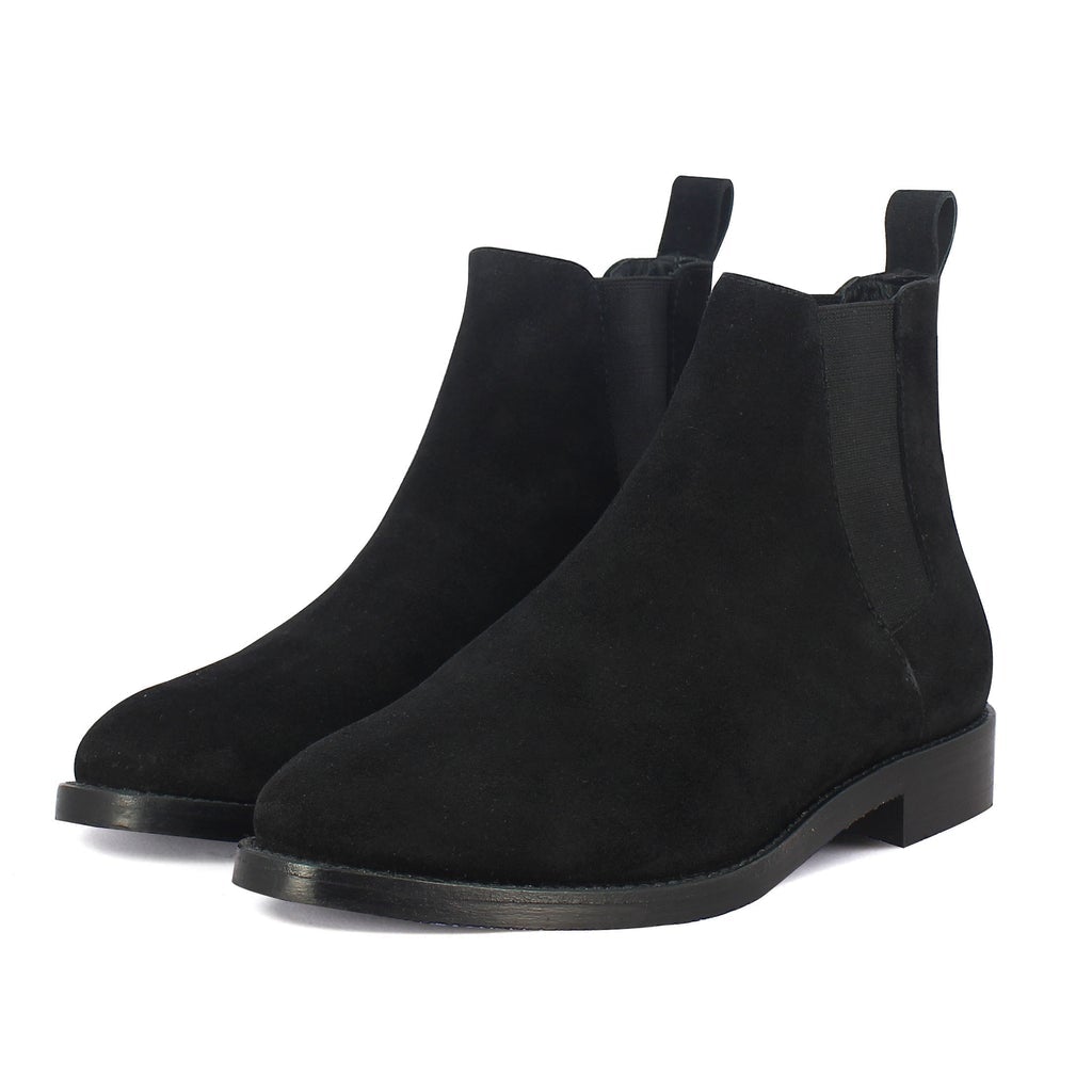 A pair of handcrafted black suede leather chelsea boot, has a slip on closure. Featuring leather pull tab and elasticated side panels to ensure comfortably slip them on and off. Its complete with leather lining and padded leather footbed. The slip on boot sit on a crepe sole.