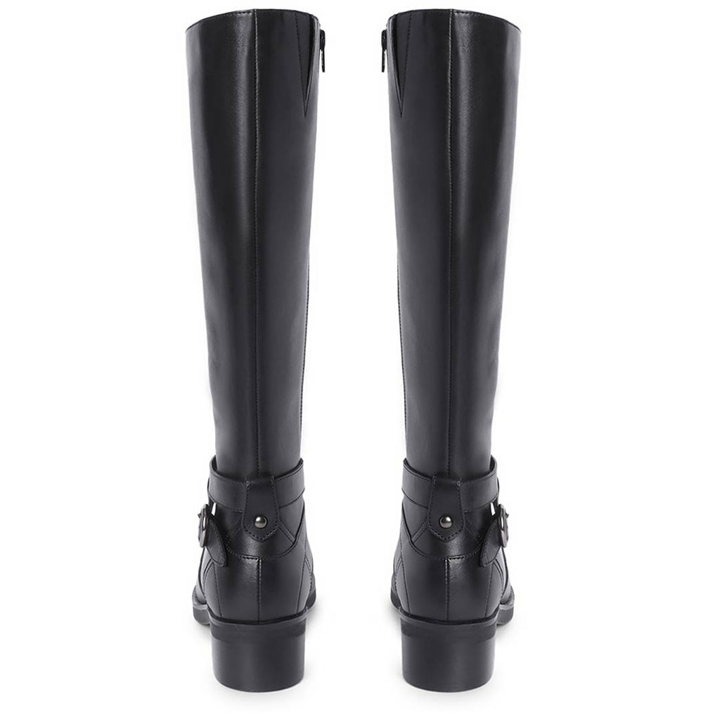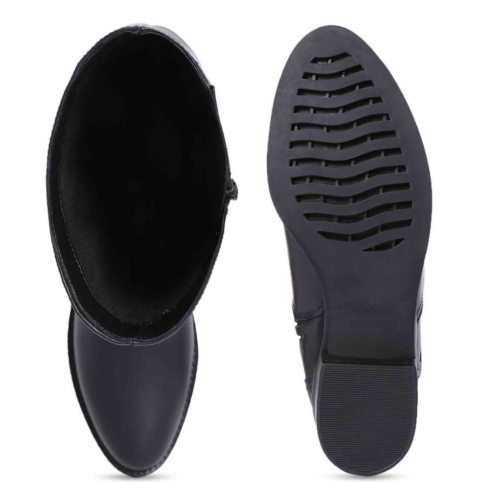 Pair our SaintG Boot with midi-skirts, flared pants or long dresses. Made in black crust leather, these knee high long boots are a winter sweetheart. An easy-to-close zip and silver buckles adds comfort and look to its style quotient. These knee high boots will keep you warm and on-trend. These will be love at first sight when you put these boots on.