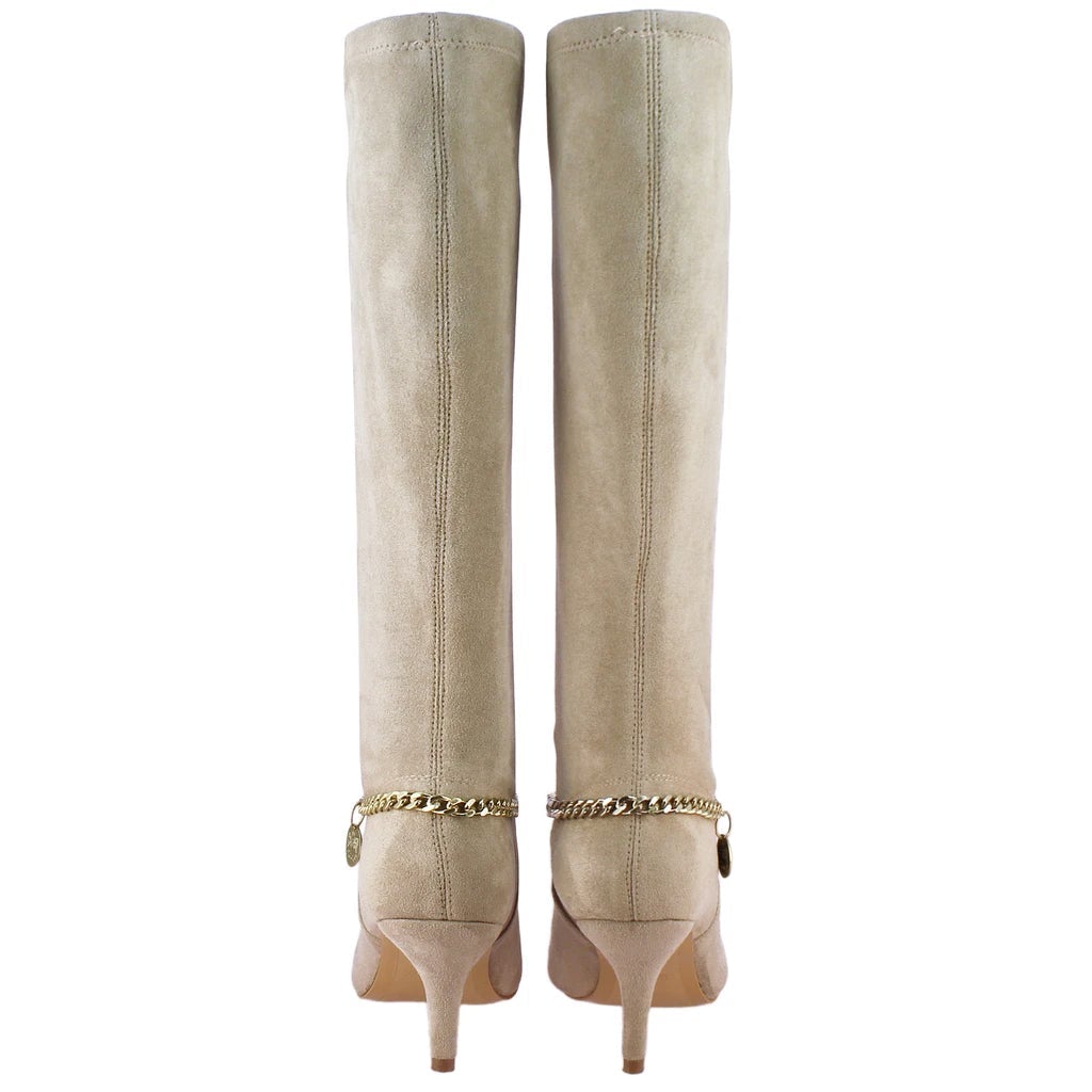Saint Idalia Taupe Stretch Suede Golden Chain Knee High Long Boots