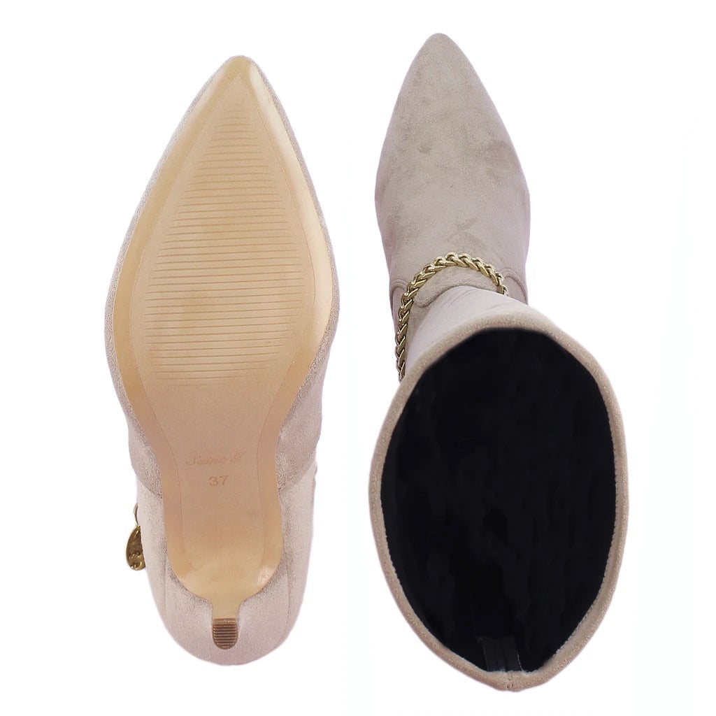 The Idalia taupe color stretch suede knee high boot is a luxury that cleverly combines a stylish youthful outlook. Embellished with a detachable gold tone chain at ankle that promises to add a subtle shine to any outfit. These knee high boots has a taupe color stretch suede upper and a pointed toe to add a touch of style to your everyday look. Made from the finest materials and finished with trending design details. Features a covered stiletto heel, stitching details with paneled finish. complete with leather insole, leather lining and tunit sole.