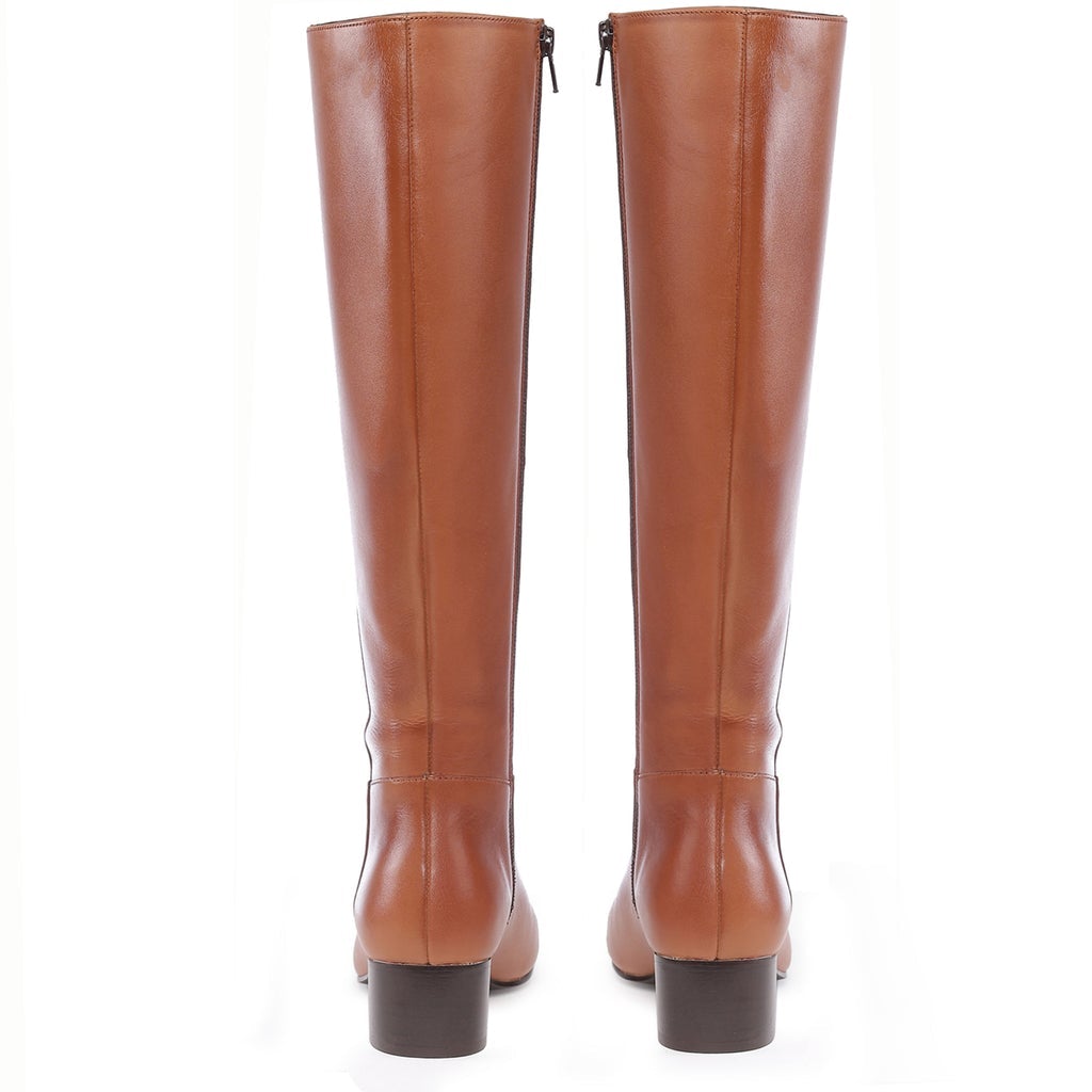 Turn head with the Saint Ivanna tan leather handcrafted knee high long boots from SaintG. Featuring a low block heel, an inside zip closure to ensure comfortably slip them on and off. Complete with a soft leather and fleece lining for comfort and breathability, padded leather socks with tunit sole. Made from the finest materials and finished with trending details.