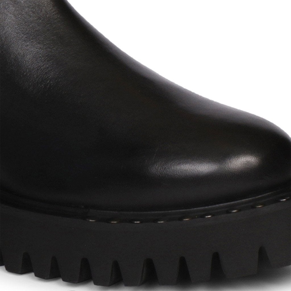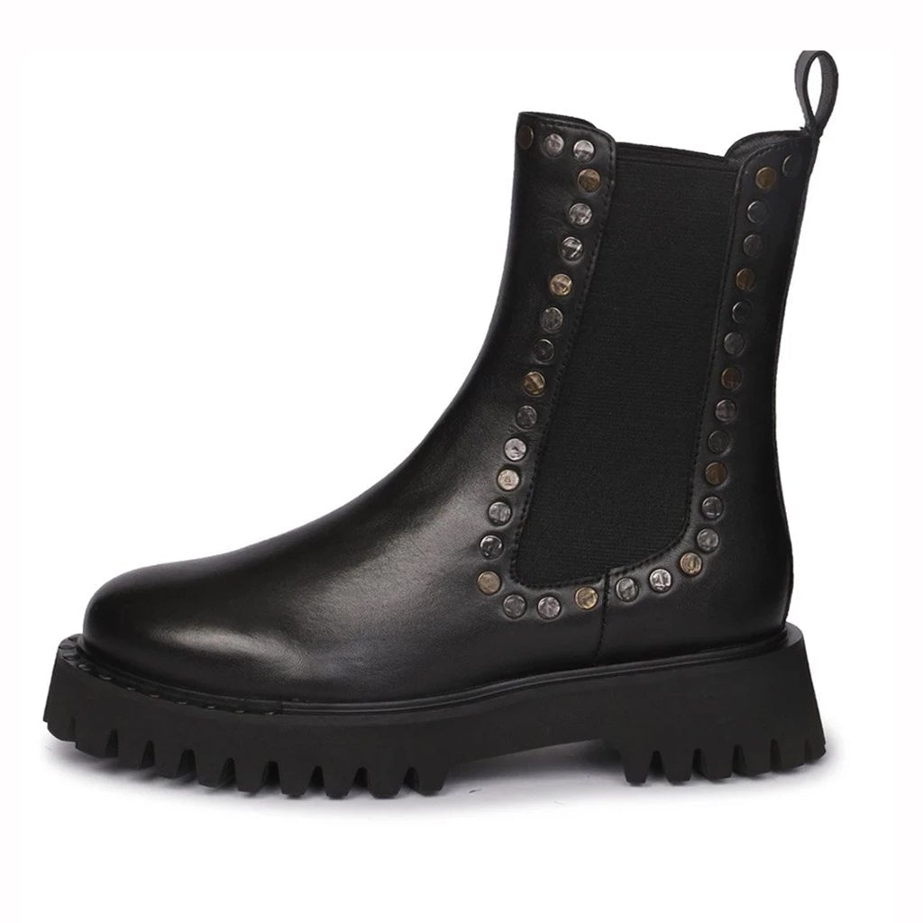 Set the trend this season in these Jessica metal studded boots crafted from genuine leather by SaintG, Fitted with elasticated side gores to easily slip on and off. The premium leather upper assures comfort, while the handmade eva sole guarantees traction irrespective of the surface. Metal studs detailing on the elasticated side panel and pull up tab on the back completes the design.