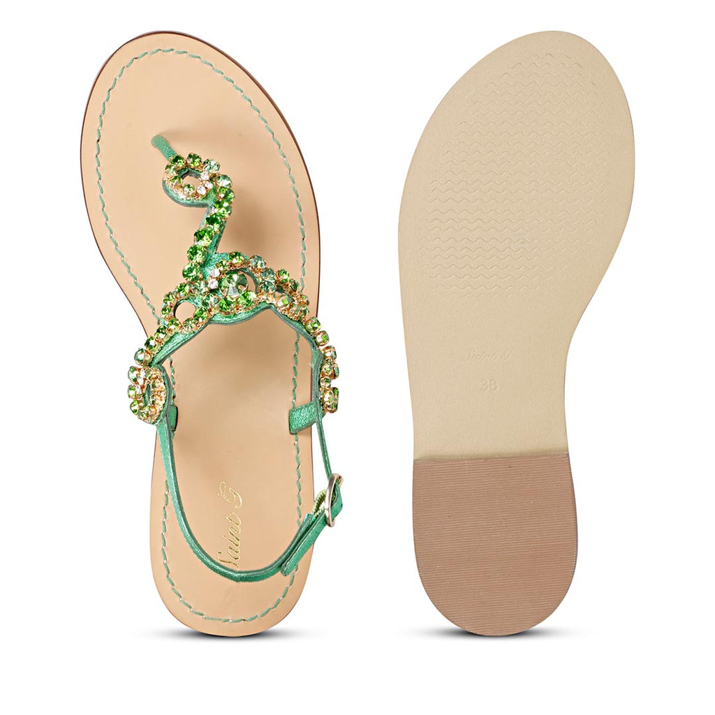 Shine bright like a diamond with these multi stone hand embroidered Kia Green metallic leather Sandals!  The dazzling multi-stone hand-embroidered design exudes luxury, while the buckle fastening strap and leather lining provide comfort and durability. Complete with a tunit sole, these sandals are a must-have for any fashion-forward individual.