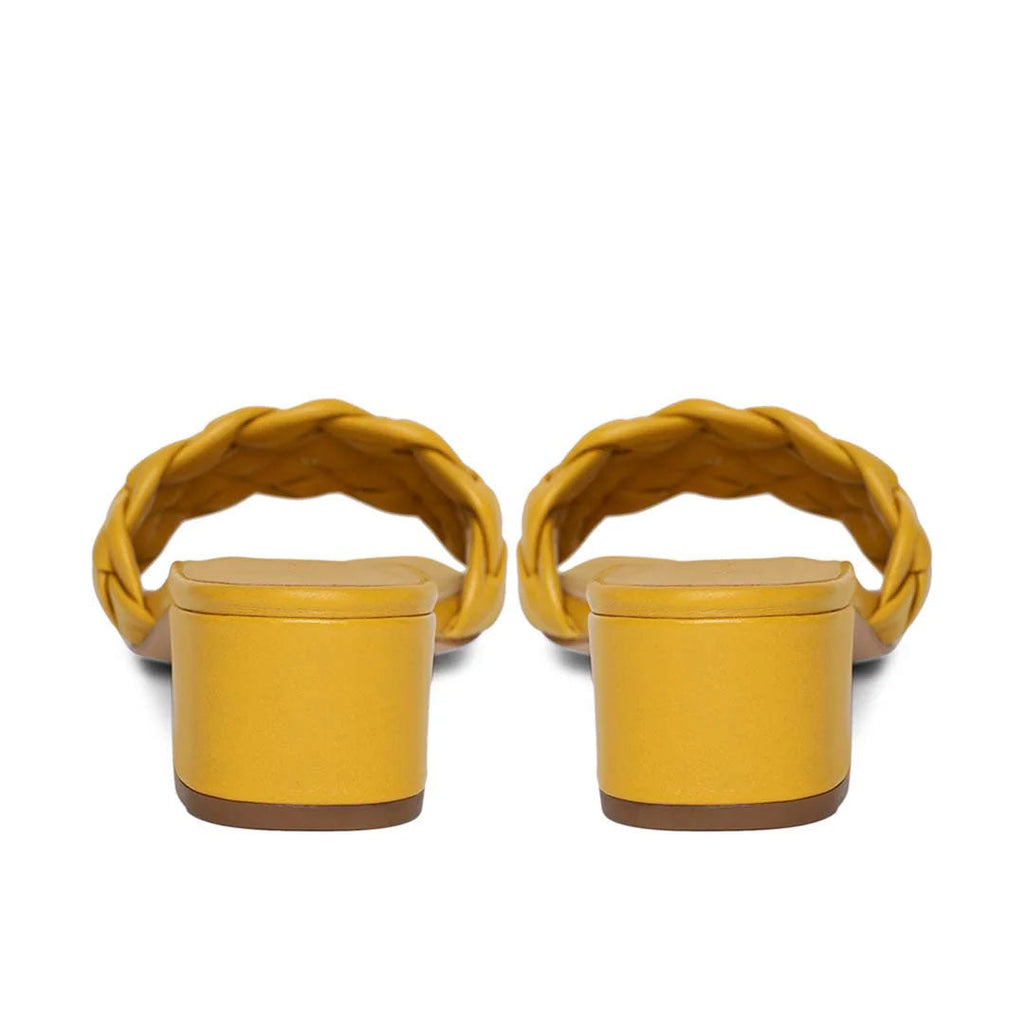 Grow your stylish wardrobe with a pair of soft cushioned hand woven mustard leather mid block heel from SaintG. A high-coverage mule featuring a statement woven strap and an elongated square toe and a short mid-heel. Woven features and a walkable heel make it so desirable. It comes with a veneer leather covered heel, full leather lining and padded leather footbed for natural comfort and breathability. This slip on heel will lend a stylish look to your outfit.